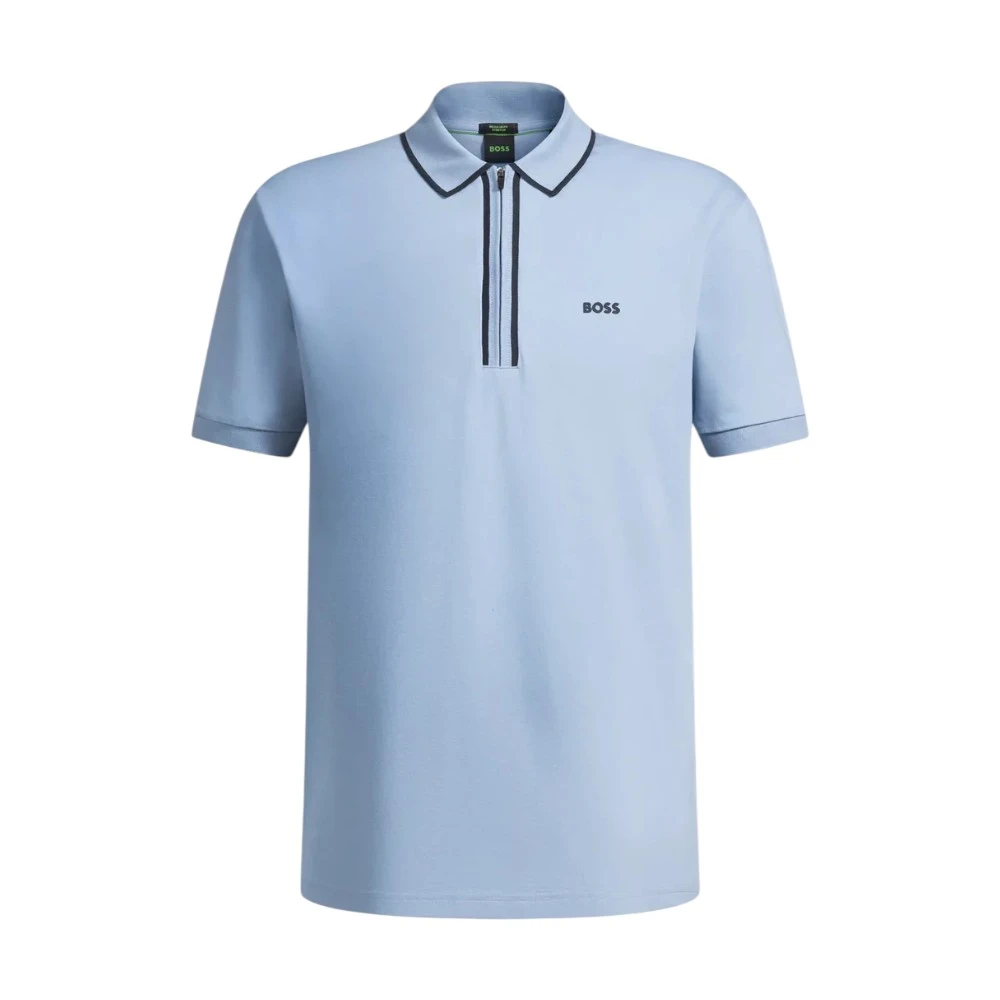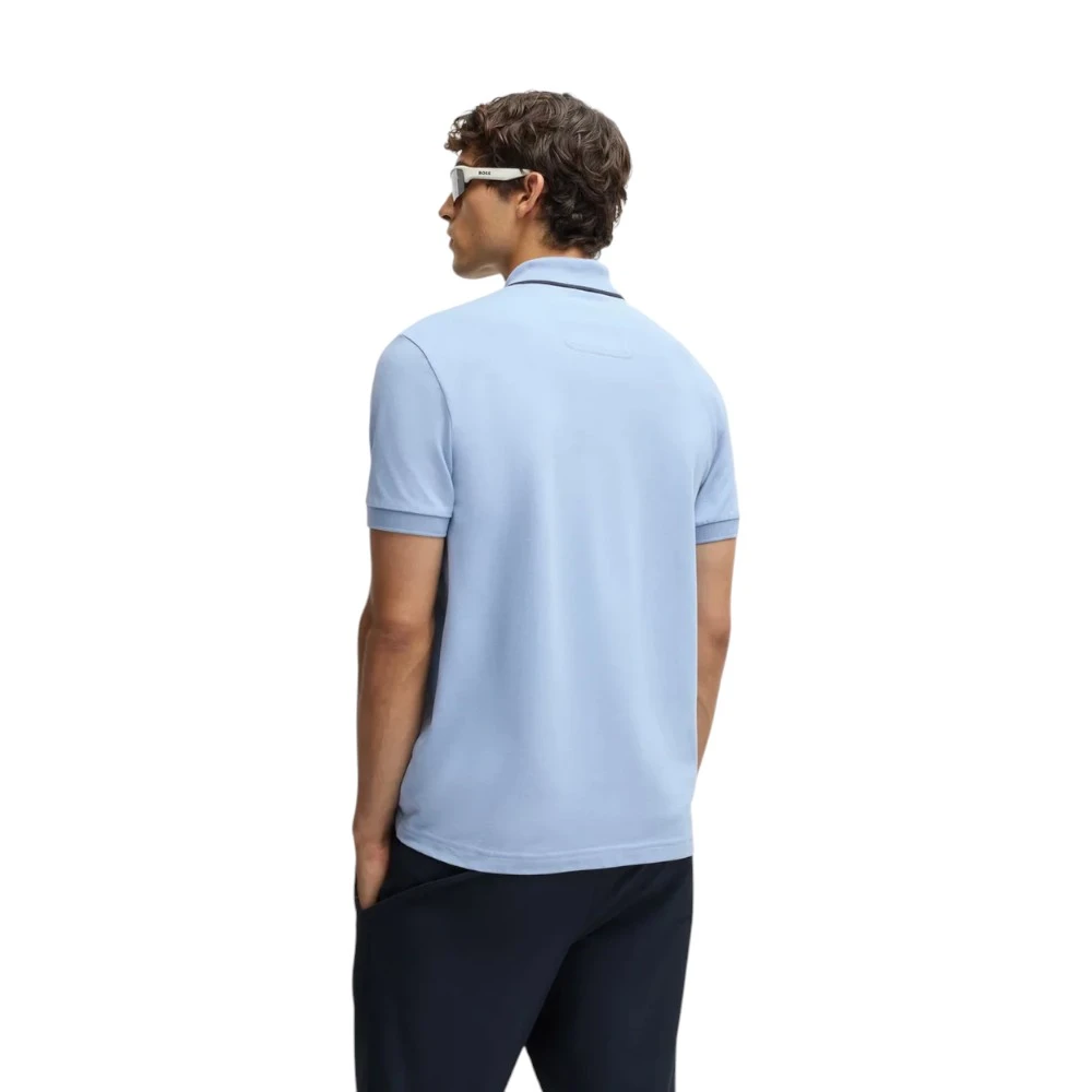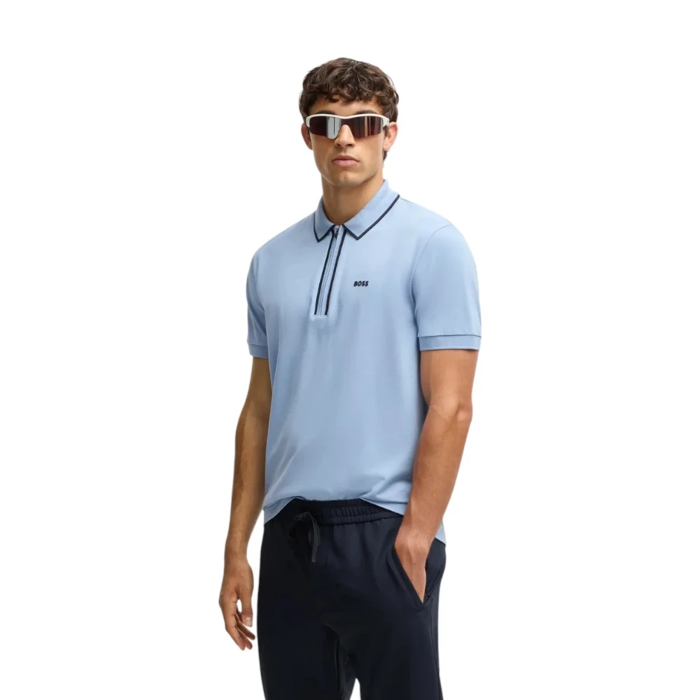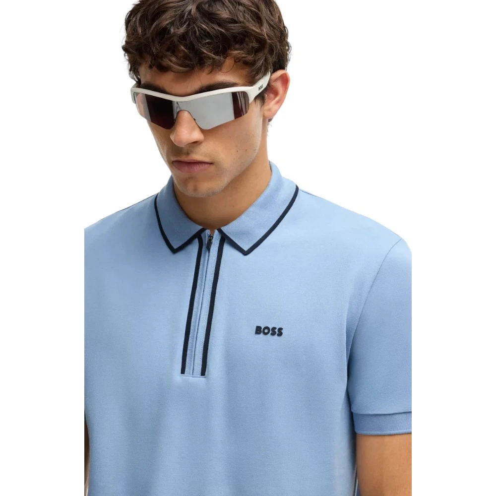 Мужское поло Boss Philix Tape в голубом цвете — стильная и современная модель для мужчин, ценящих комфорт и элегантность в повседневном гардеробе. Изделие выполнено из мягкого хлопкового материала с добавлением эластана, благодаря чему ткань приятно ощущается на теле, хорошо пропускает воздух и сохраняет аккуратную посадку в течение дня.