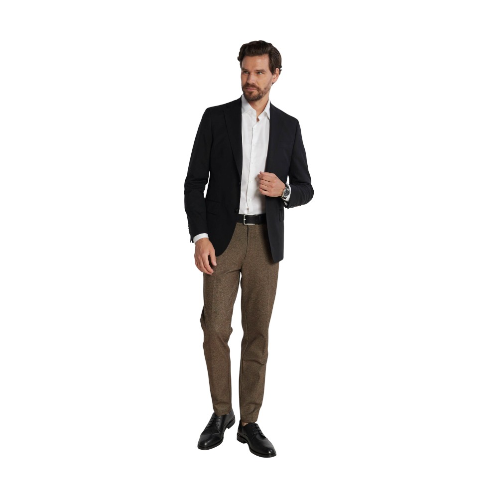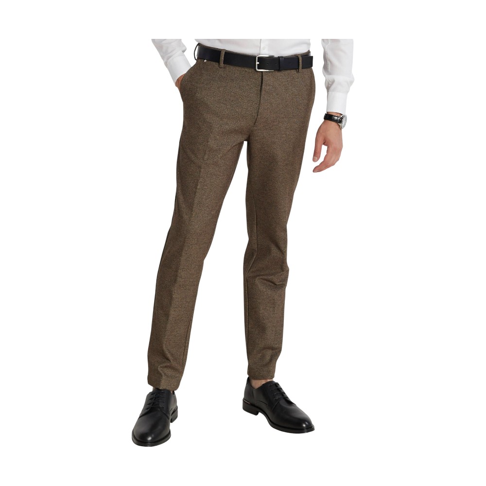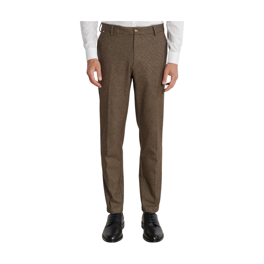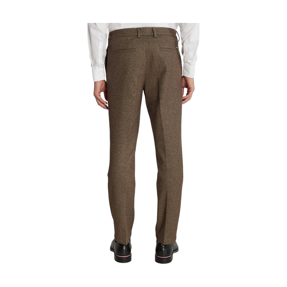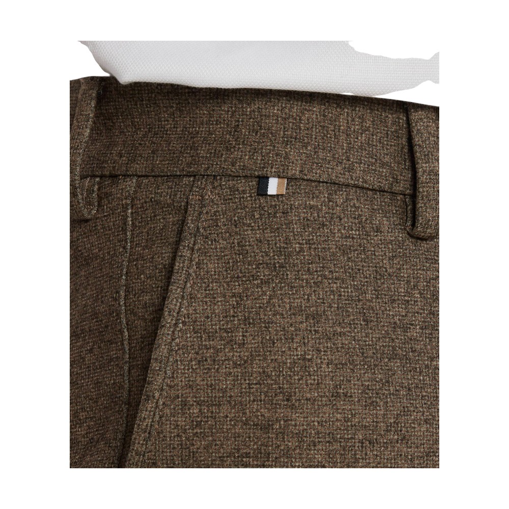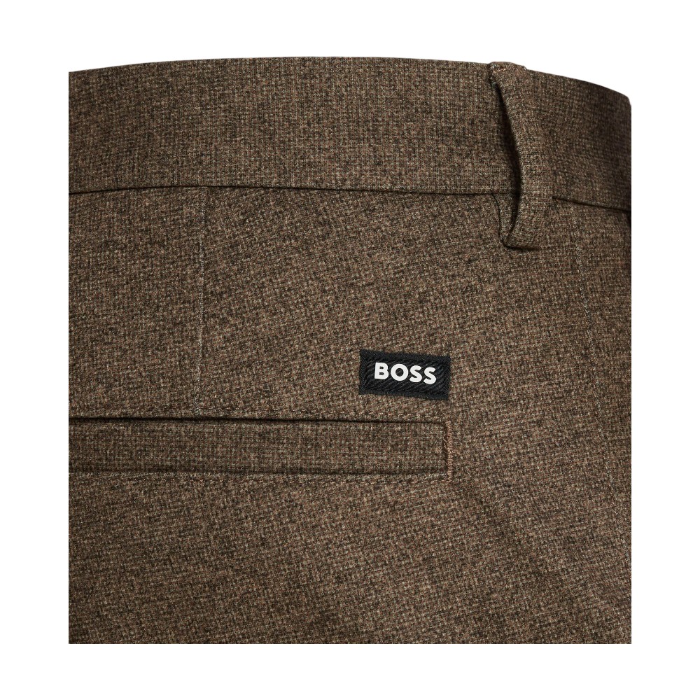 Базовые брюки из мужской коллекции BOSS. Модель зауженного книзу кроя с застежкой-молнией и пуговицей, боковыми карманами и шлевками для ремня выполнена из смесового эластичного материала с высоким содержанием нежной вискозы.