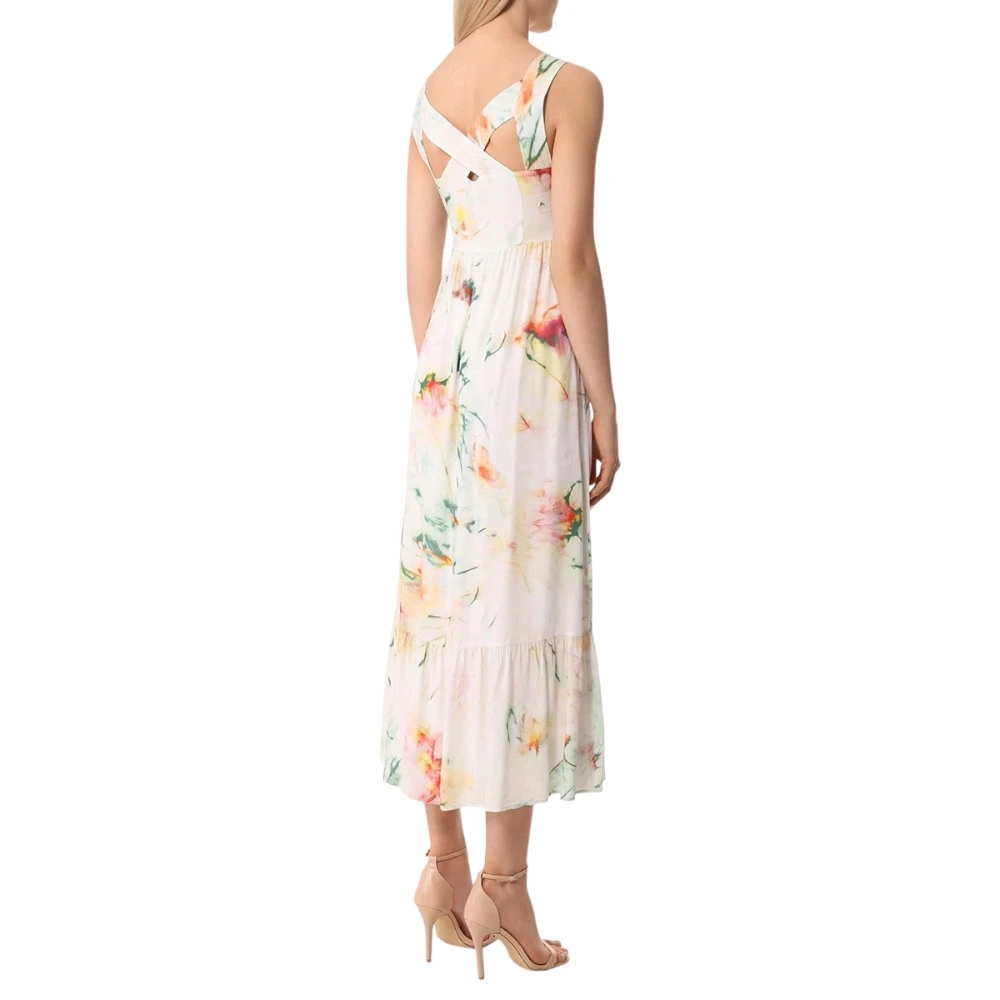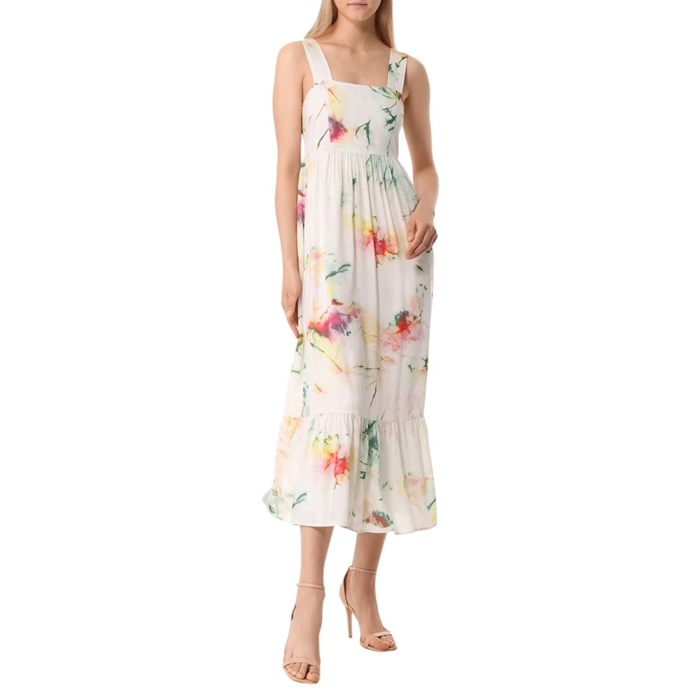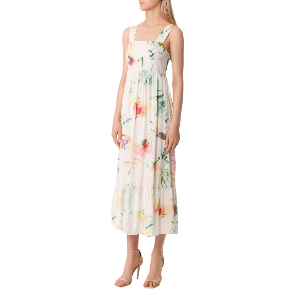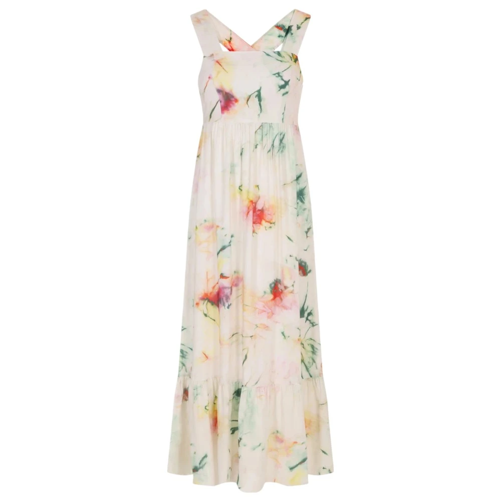 Платье-макси из вискозы с принтом от BOSS BLACK. -Модель с клешем кроя от груди, широкими бретелями на плечах, юбкой А-силуэта с декором подола широкой оборкой, застежкой на потайную молнию сбоку.
