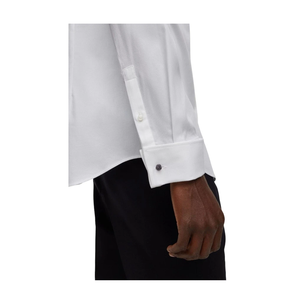 Рубашка Boss H-Hank — воплощение современного мужского стиля и безупречной посадки. Приталенный силуэт подчёркивает фигуру, сохраняя при этом свободу движений благодаря натуральному хлопку с лёгкой эластичностью. Классический воротник и французские манжеты придают образу деликатную утончённость, а лаконичный дизайн делает модель универсальным элементом делового и повседневного гардероба. Эталон элегантности в исполнении BOSS.