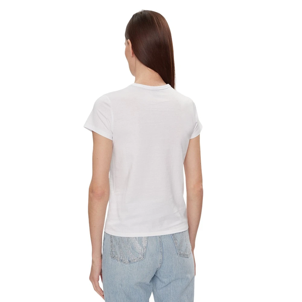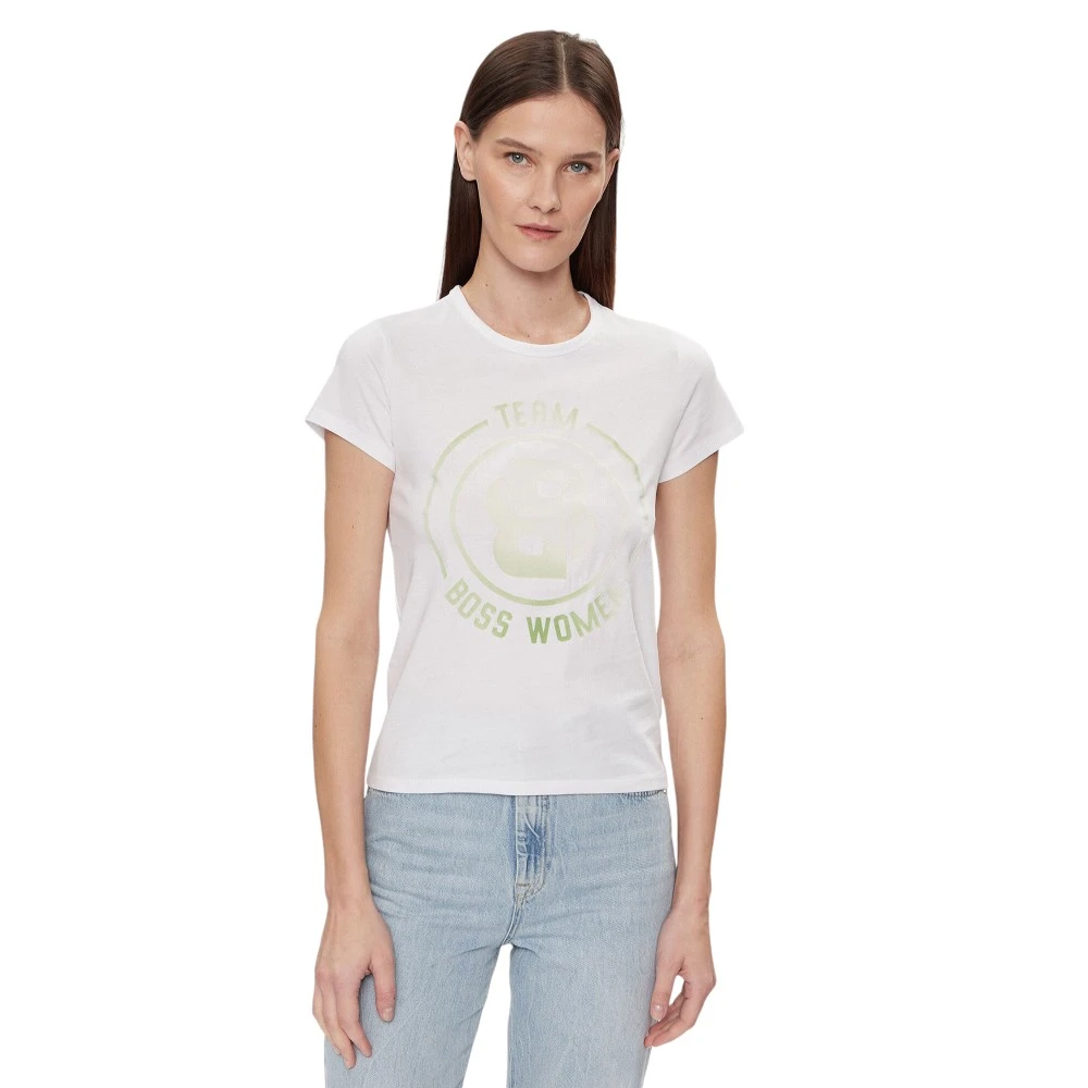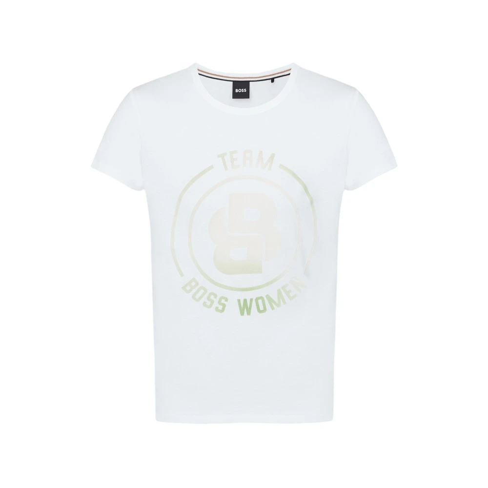 Женская футболка от BOSS в белом цвете с короткими рукавами (длина 13 см для размера S). Модель украшена минималистичным логотипом бренда, что добавляет стильный акцент.
