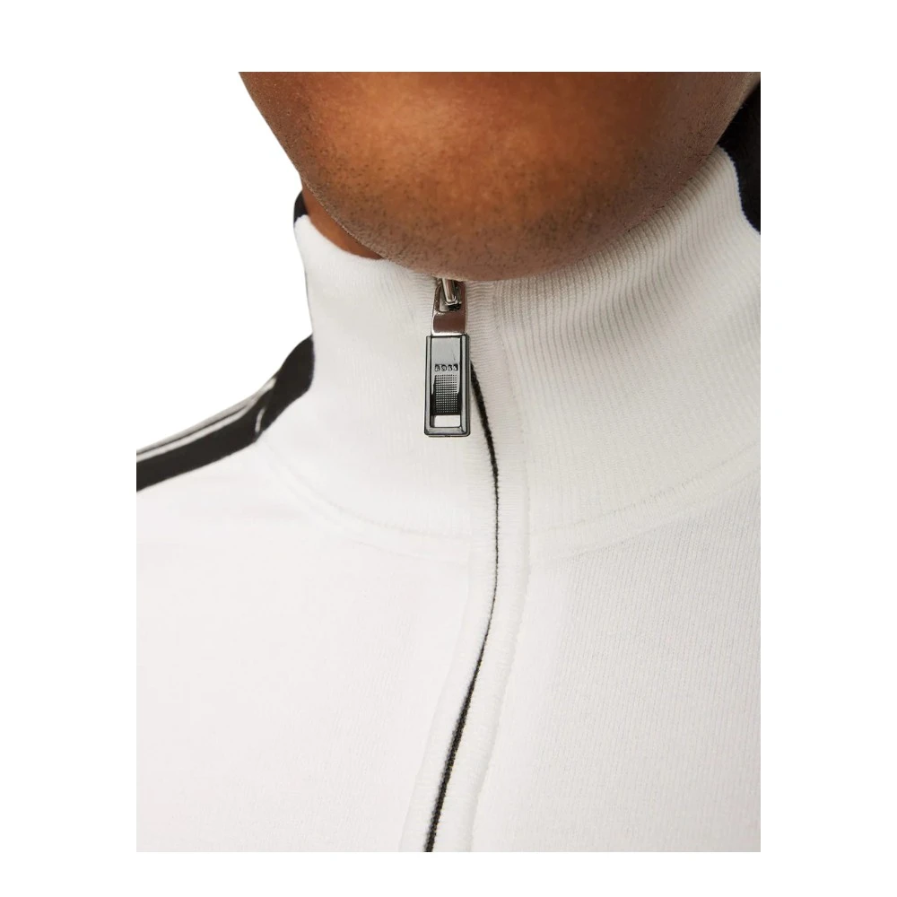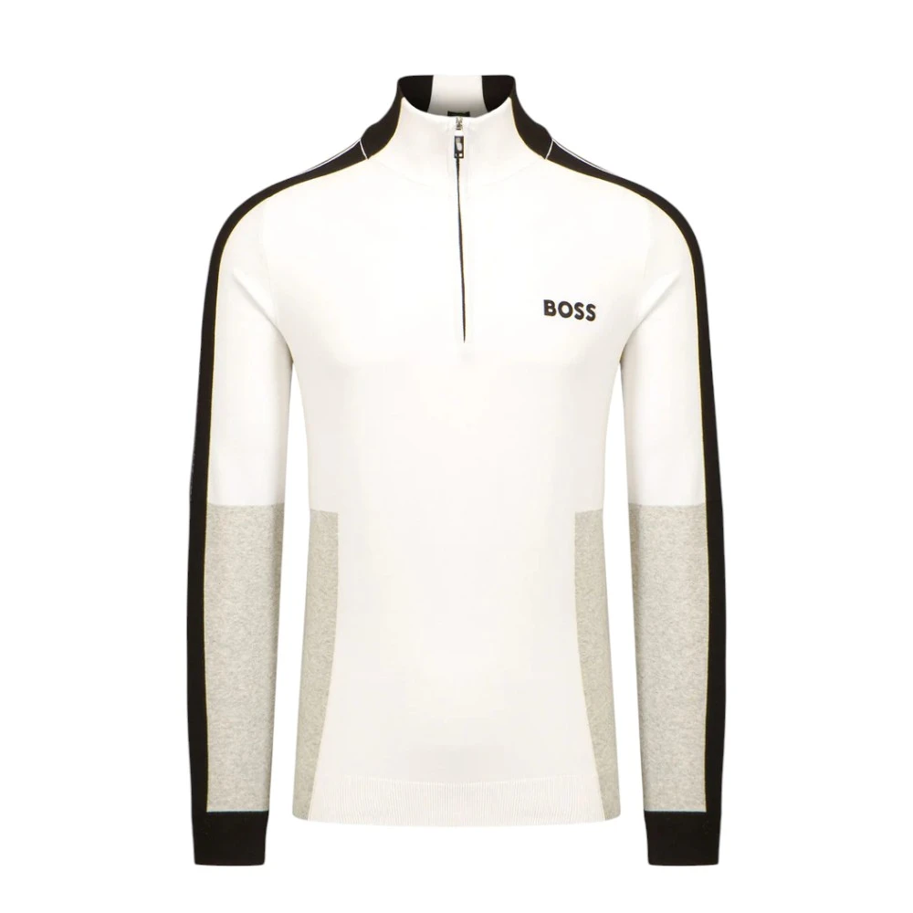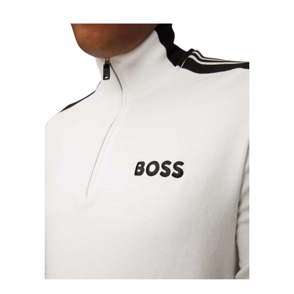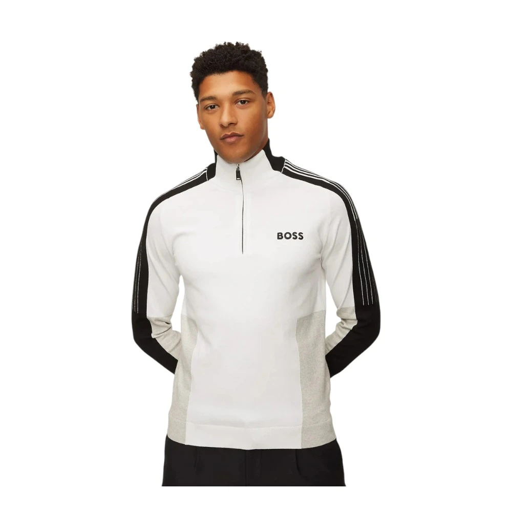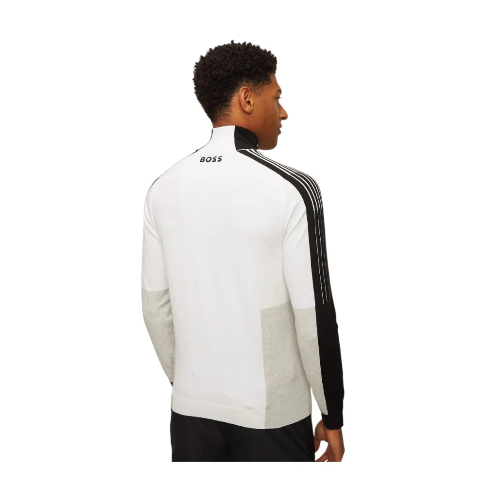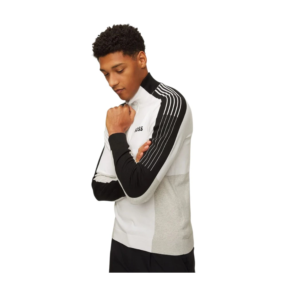 Свитер Boss Zolkar — воплощение элегантного спортивного стиля. Модель прямого кроя выполнена из мягкого и приятного к телу материала, обеспечивающего комфорт в любое время года. Застёжка-молния на горловине образует воротник-стойку, добавляя функциональности и современного акцента. Контрастные цветовые блоки и вышитый логотип подчёркивают динамичный характер бренда. Идеальный выбор как для игры в гольф, так и для стильного повседневного отдыха.