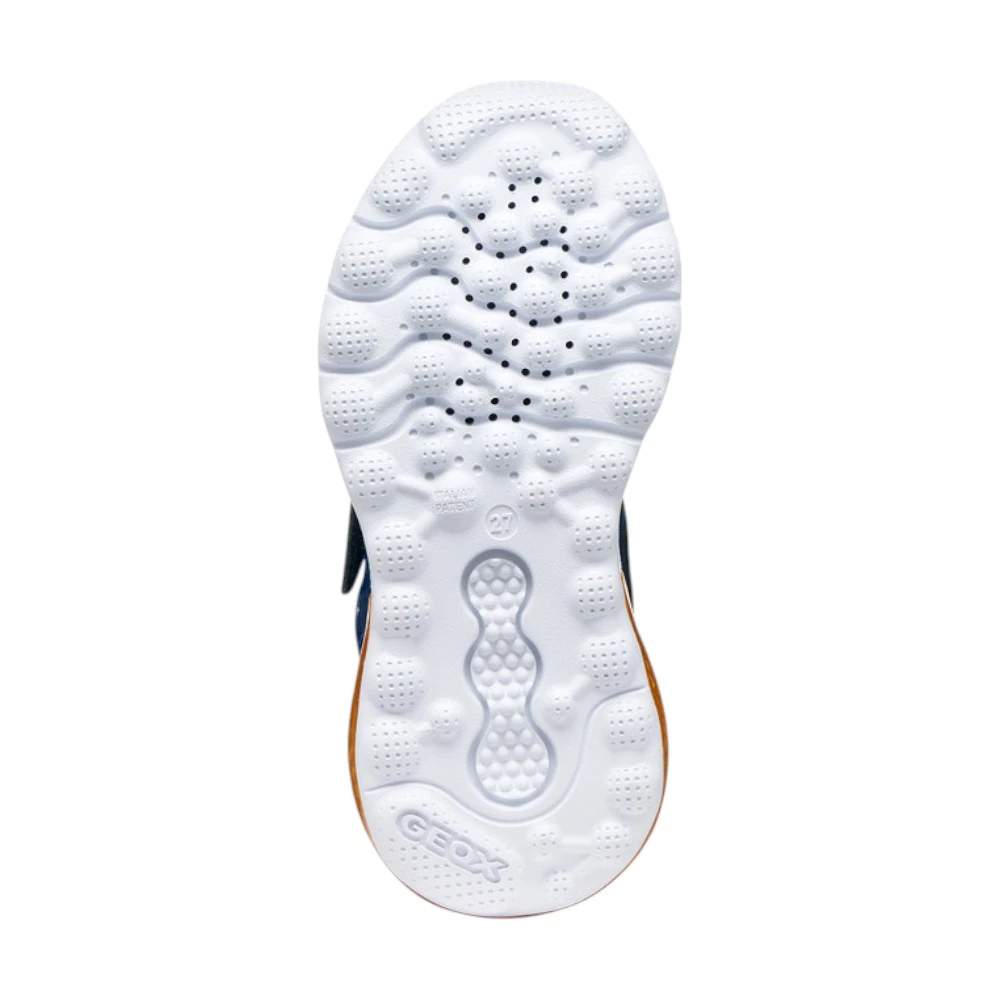 Верх выполнен из сочетания прочной ткани и материалов с эффектом тиснёной кожи. Такая комбинация обеспечивает оптимальный баланс между лёгкостью, износостойкостью и комфортом при ежедневной носке. Конструкция хорошо адаптирована к активному детскому движению и подходит как для прогулок, так и для насыщенных игровых дней. Особое внимание привлекают светящиеся элементы на подошве, которые отражают свет от поверхности и создают выразительный визуальный эффект при ходьбе и беге. Амортизирующая подошва смягчает каждый шаг, снижая нагрузку и обеспечивая устойчивость. Фирменная дышащая технология Geox способствует циркуляции воздуха внутри обуви, поддерживая комфорт даже при высокой активности.