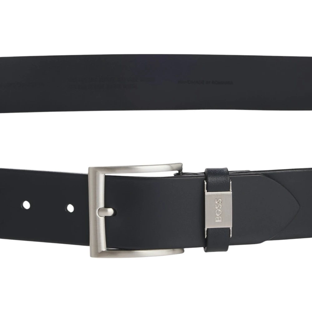 Минималистичная металлическая пряжка с лаконичным дизайном подчеркивает фирменный стиль Boss. Точная обработка краев, аккуратная строчка и продуманная конструкция обеспечивают комфортную посадку и надежную фиксацию в течение всего дня. Ремень легко сочетается с классической обувью, лоферами или дерби, создавая завершенный образ.