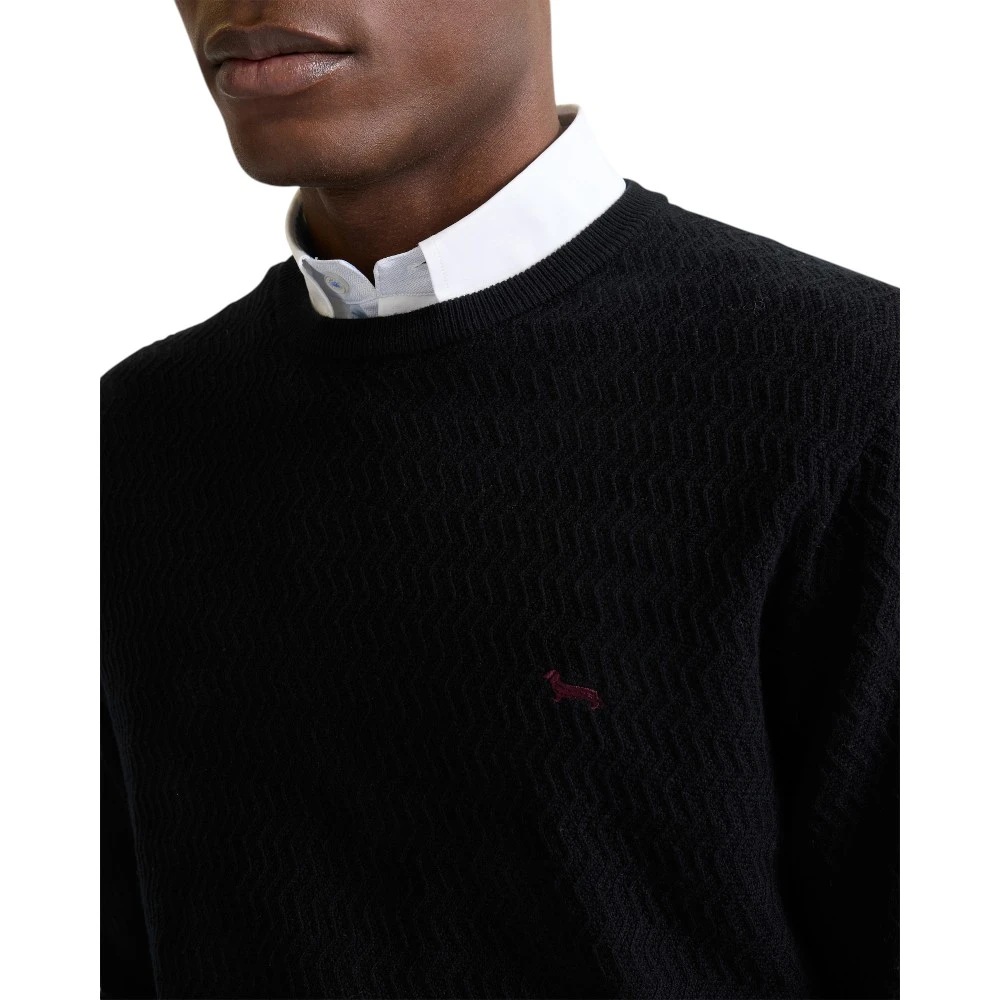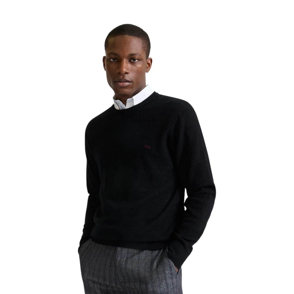 Манжеты и нижний край выполнены из эластичной трикотажной резинки, что обеспечивает удобную посадку и помогает свитеру сохранять форму. На груди размещен фирменный логотип Harmont & Blaine в виде таксы — узнаваемый символ бренда.
