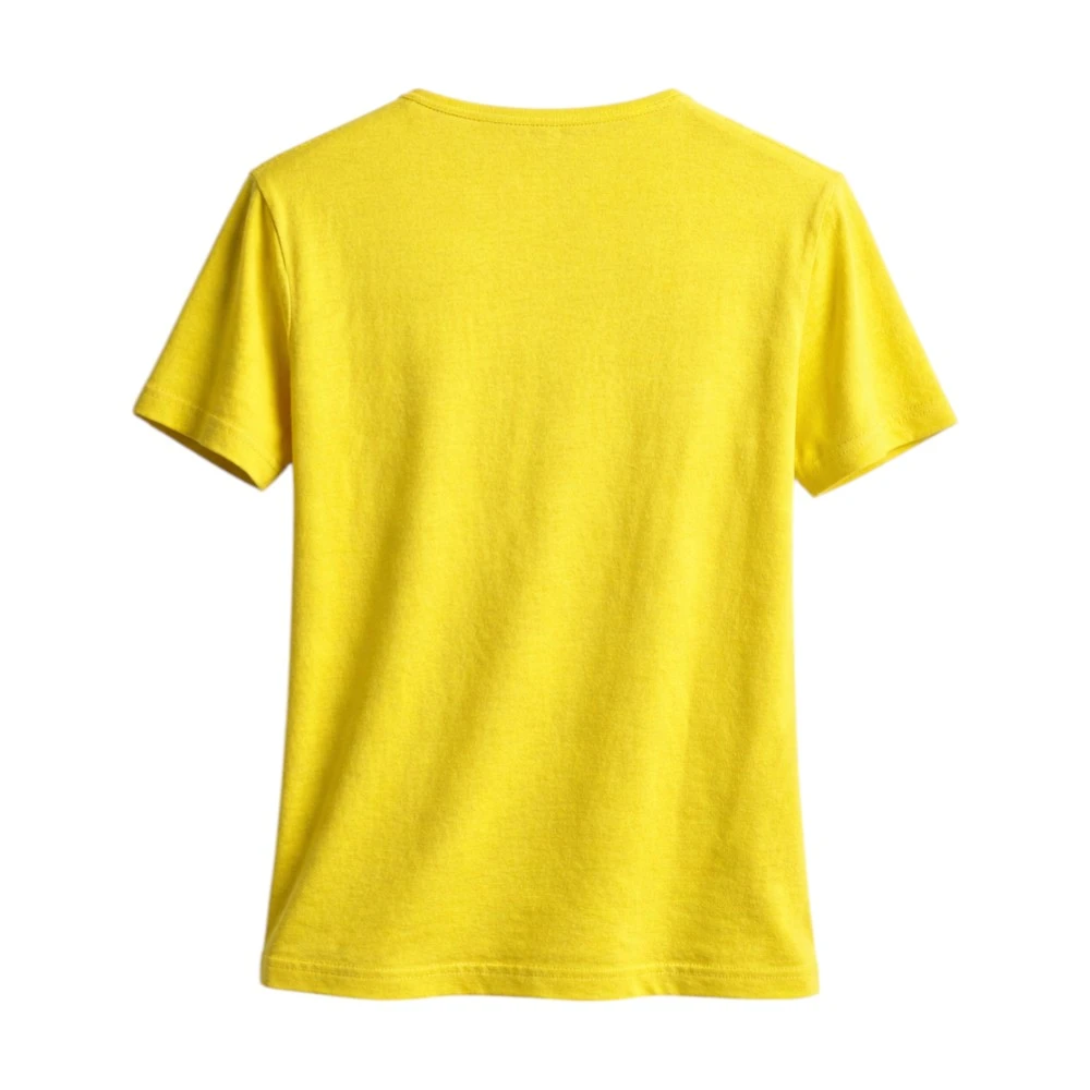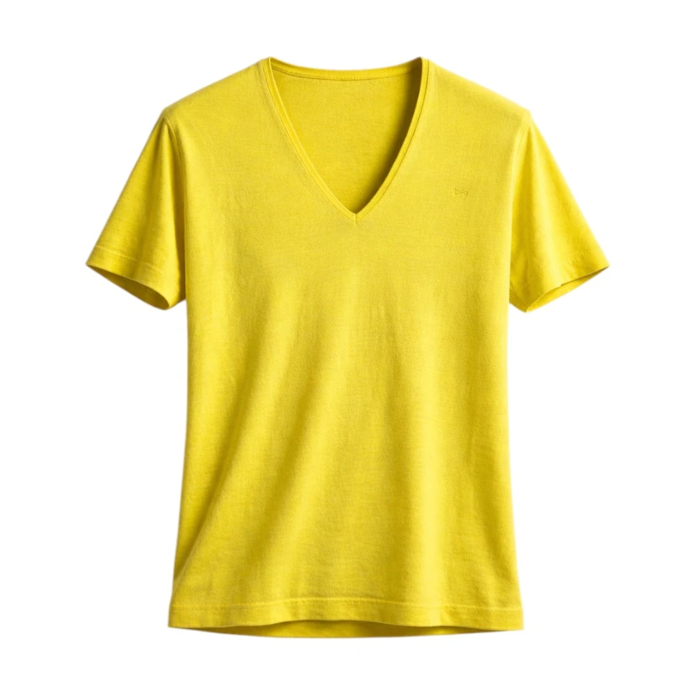 Яркий жёлтый оттенок добавляет образу энергии и свежести, подчёркивая индивидуальность и создавая настроение лёгкости и лета. Глубокий V-образный вырез визуально вытягивает силуэт и делает модель более женственной, а лаконичный дизайн позволяет легко интегрировать футболку в разные стилистические решения.