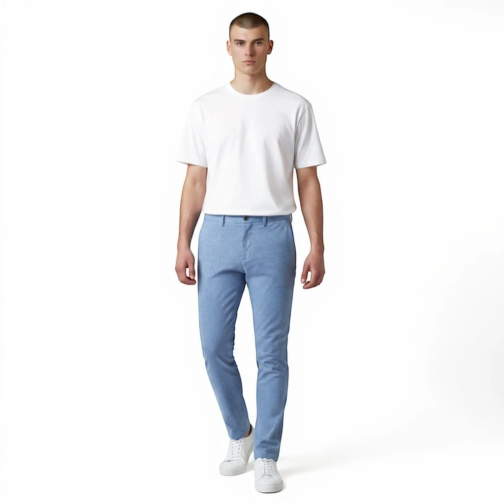 Голубой оттенок придаёт образу свежесть и лёгкость, позволяя создавать как повседневные, так и более утончённые сочетания. Зауженный крой подчёркивает силуэт и делает образ аккуратным и современным, при этом брюки сохраняют комфорт при движении благодаря добавлению эластана. Классическая посадка, пояс со шлёвками и аккуратные карманы делают модель универсальной для различных ситуаций — от деловых встреч до прогулок и отдыха.