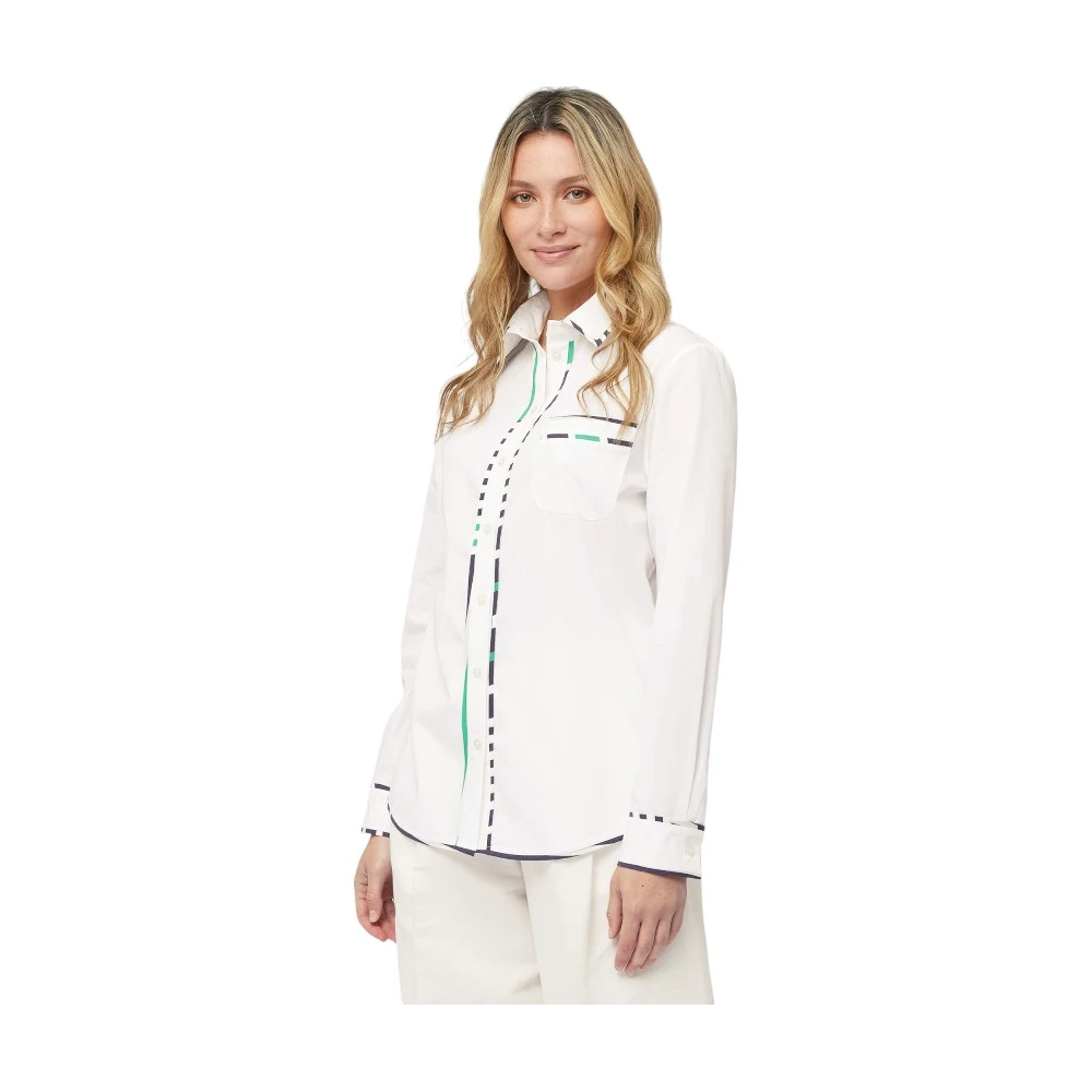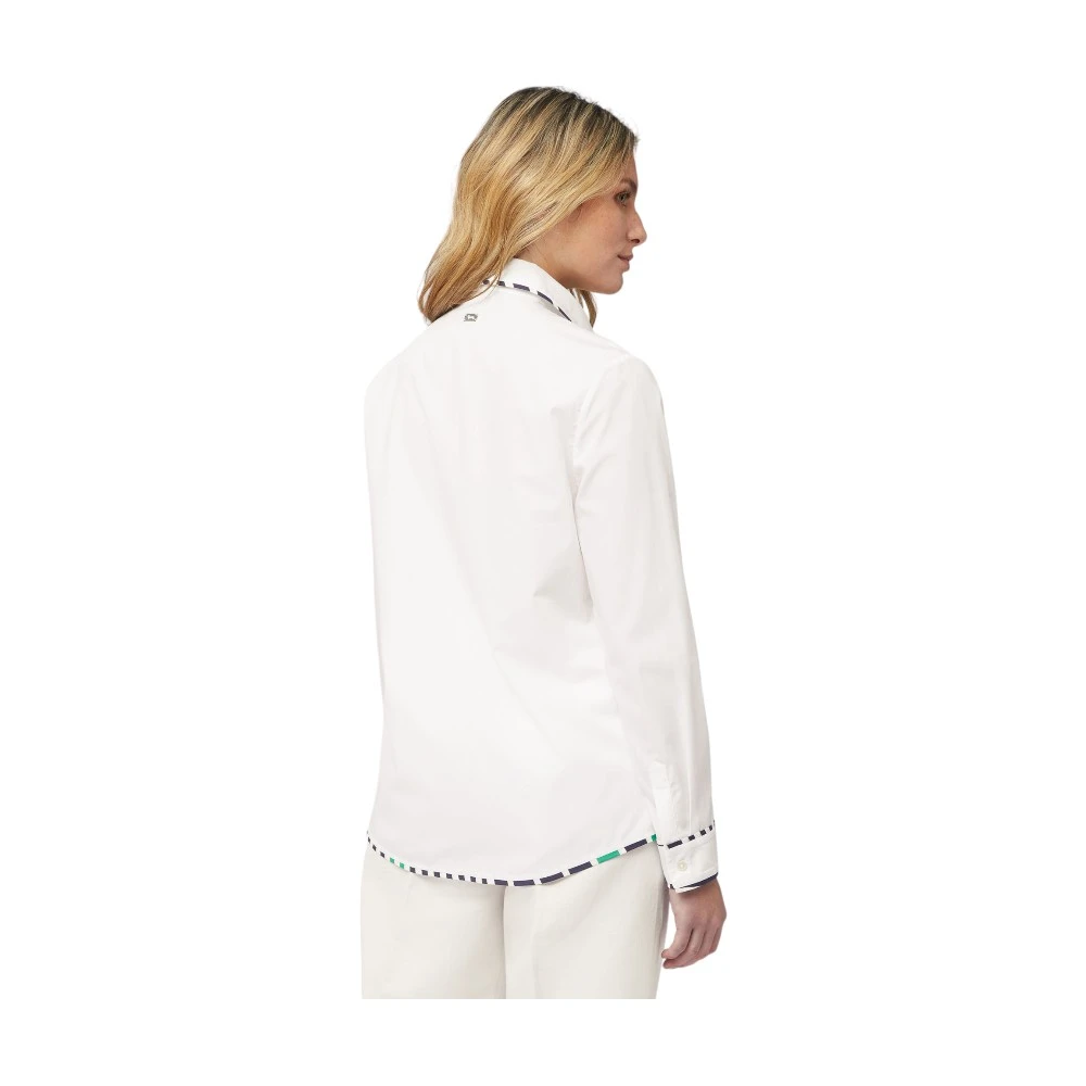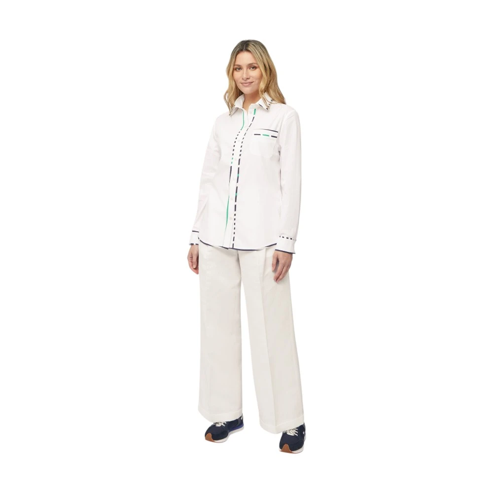 Белый цвет делает рубашку универсальной основой гардероба, которая легко сочетается как с классическими, так и с повседневными вещами. Особое внимание привлекают декоративные контрастные элементы — аккуратная отделка по планке, воротнику и карману, которые добавляют модели индивидуальности и современного характера. Свободный крой обеспечивает комфортную посадку и подчёркивает естественную линию силуэта, не сковывая движений.
