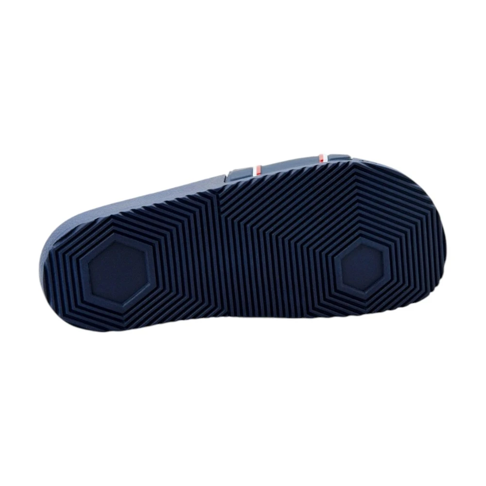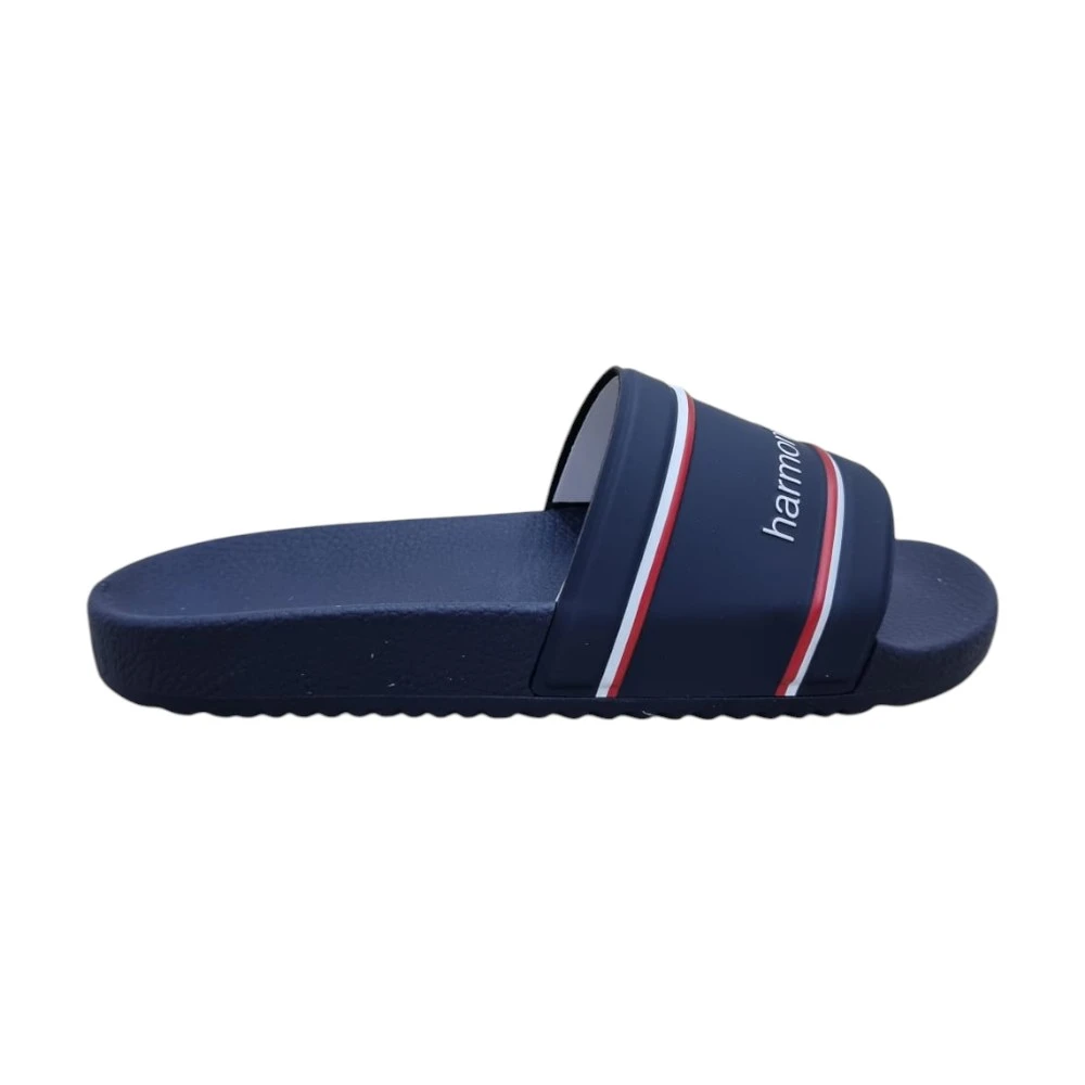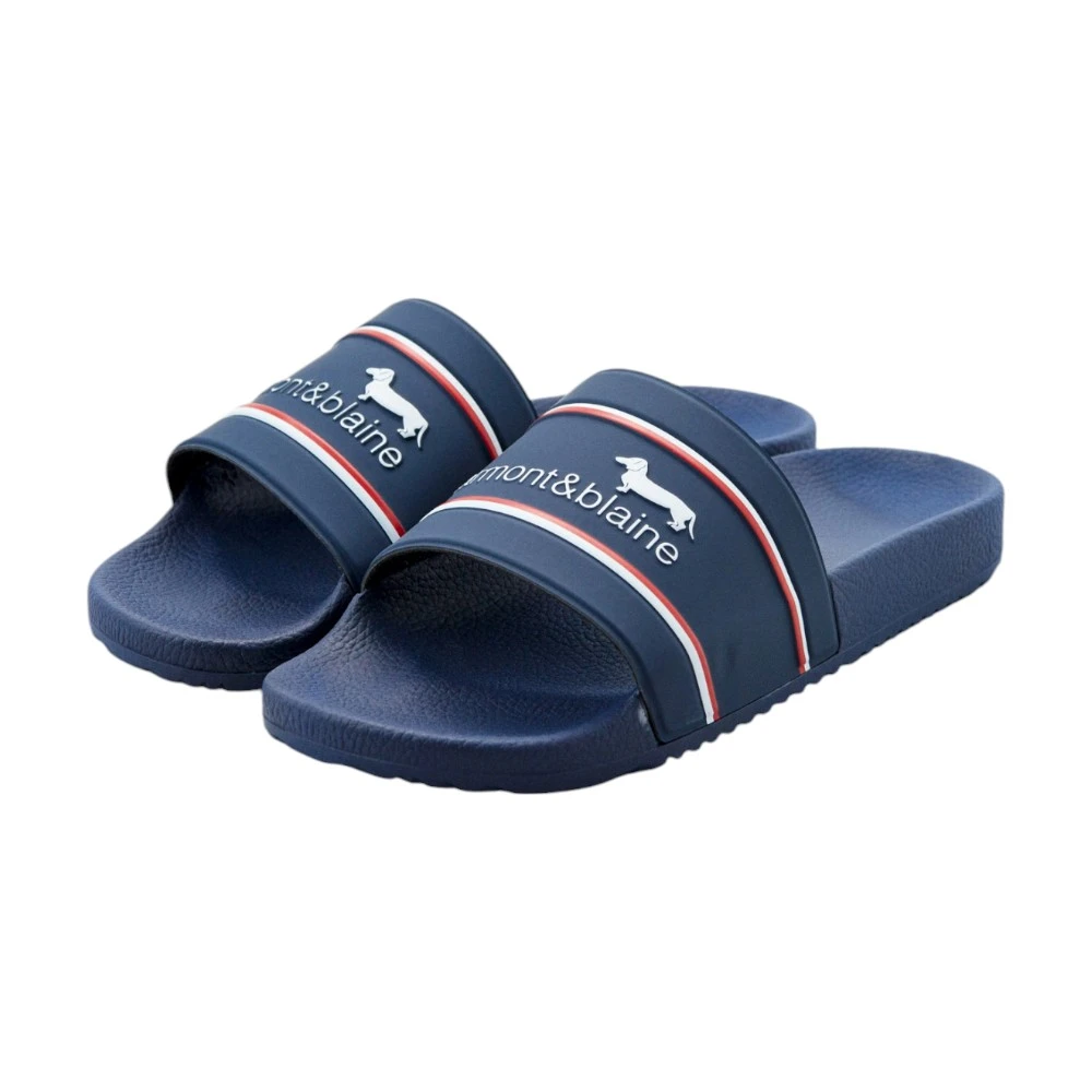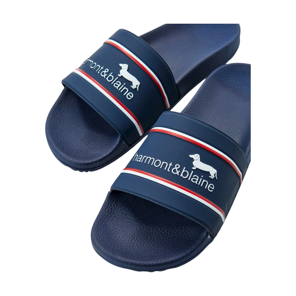 Дизайн модели выполнен в насыщенном синем цвете и дополнен контрастными полосками и фирменной надписью Harmont & Blaine с изображением таксы. Такой акцент делает шлёпки узнаваемыми и придаёт образу спортивно-современный характер.