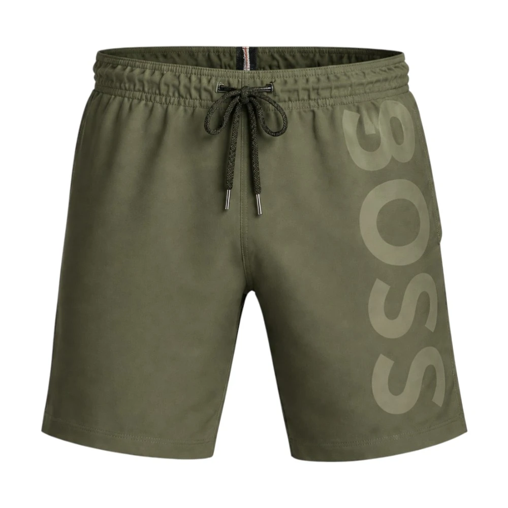 Дизайн модели дополнен крупным фирменным логотипом BOSS на боковой части, который подчёркивает узнаваемую эстетику бренда и придаёт образу выразительный современный акцент. Универсальный зелёный оттенок легко сочетается с базовыми футболками, поло и пляжными аксессуарами, позволяя создавать стильные курортные образы.