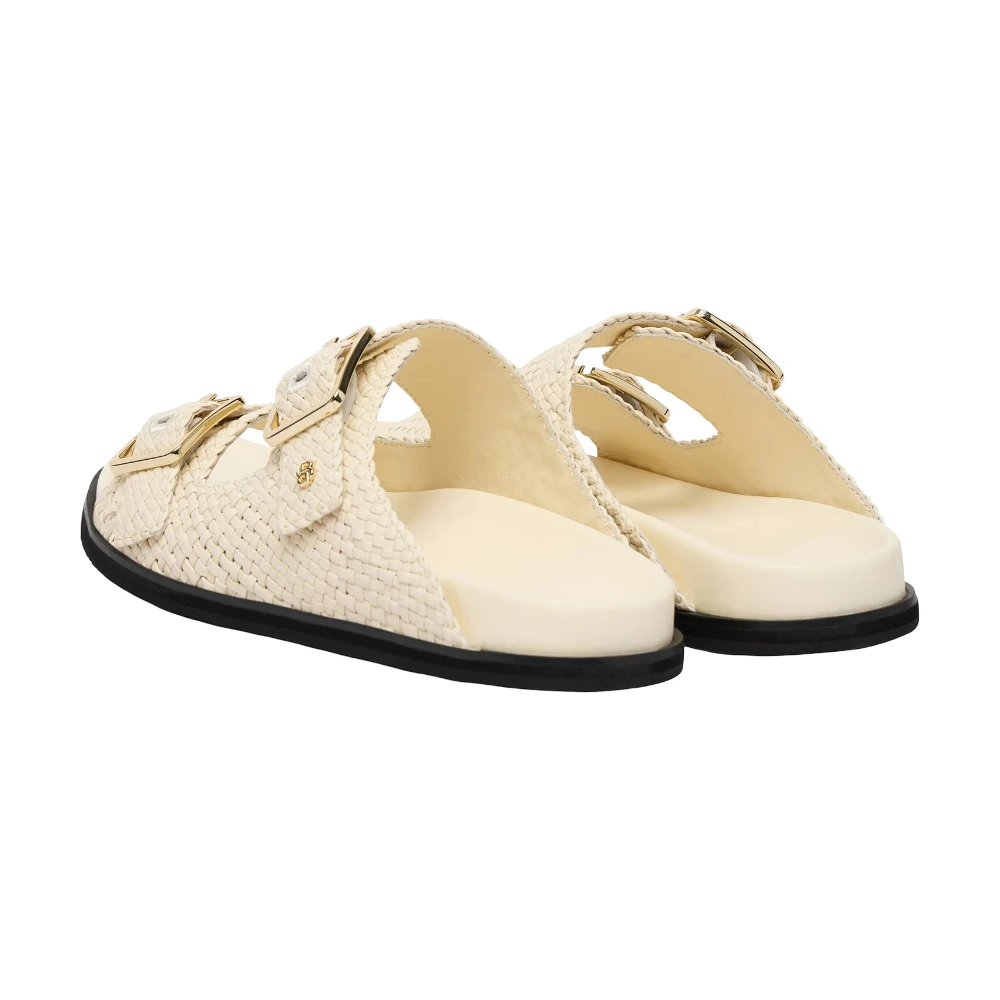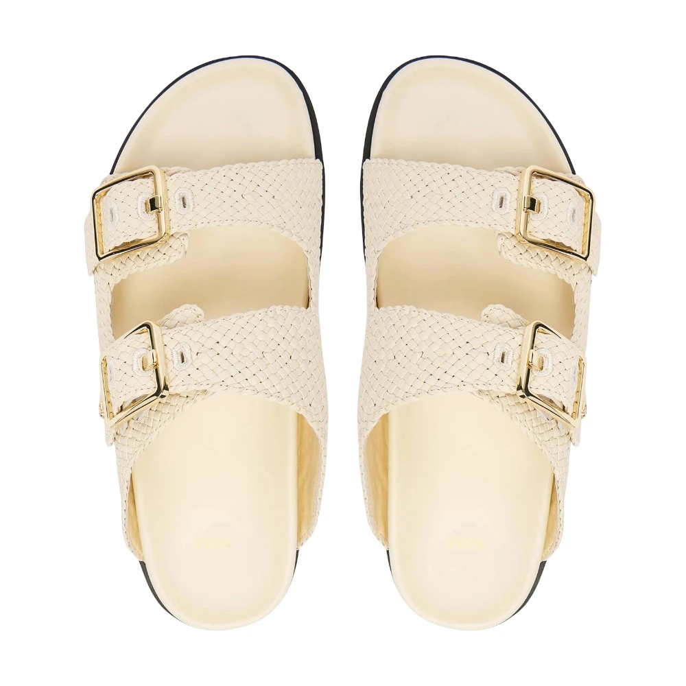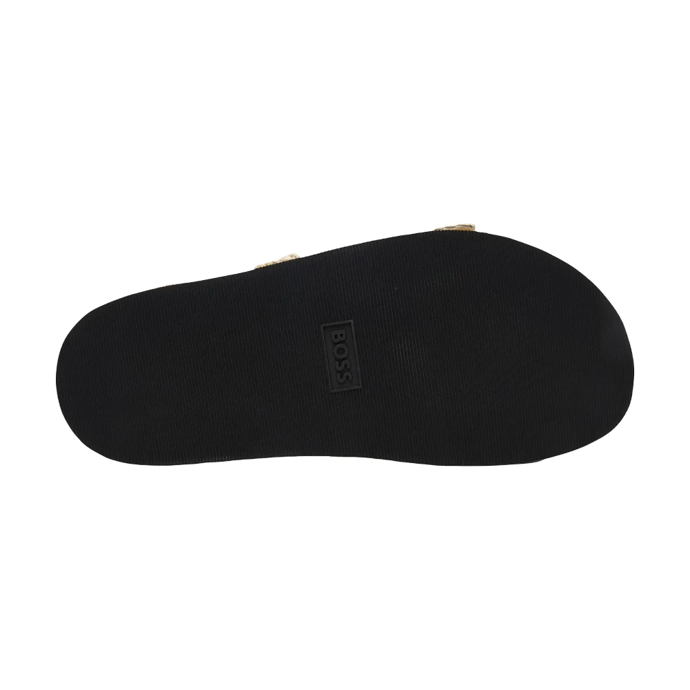 Верх выполнен из натуральной кожи с изящным плетёным дизайном, который придаёт модели глубину и визуальную текстуру. Такой подход отражает фирменный стиль BOSS — сдержанную роскошь, внимание к деталям и современную интерпретацию классики. Золотистые пряжки становятся акцентом, добавляя образу элегантности и деликатного сияния.