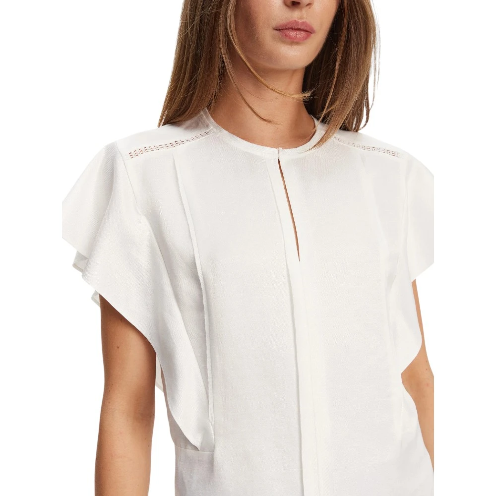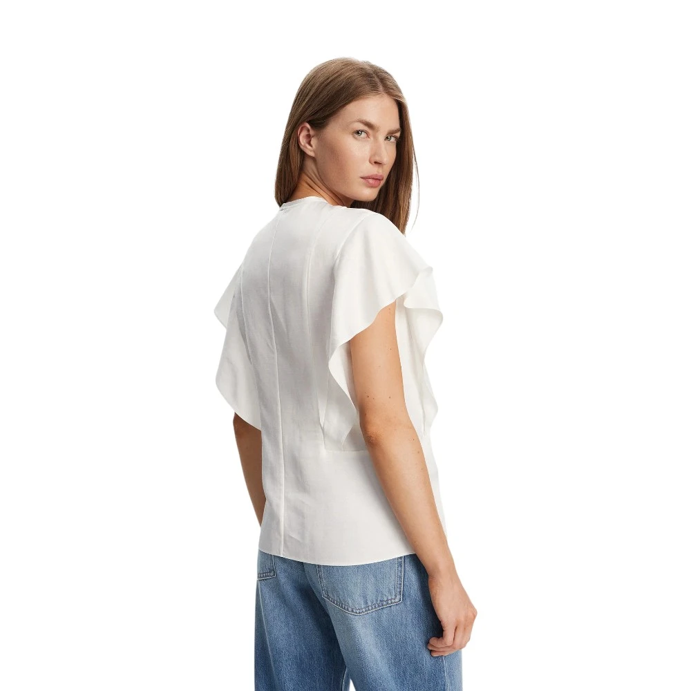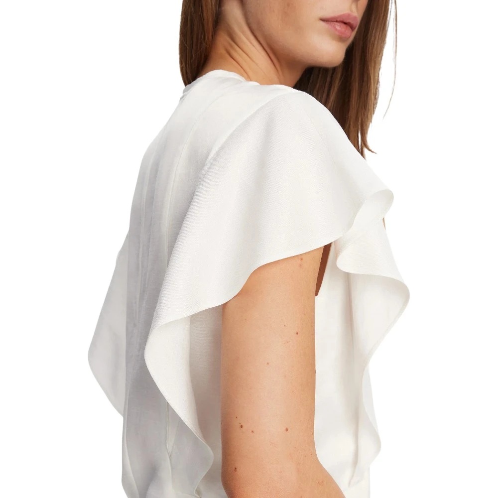 Свободный силуэт мягко повторяет линии тела, не сковывая движения. Особое внимание привлекают рукава с деликатными воланами, которые добавляют образу динамики и создают лёгкий архитектурный объём. Небольшой вырез в области горловины придаёт модели утончённость и визуально вытягивает силуэт.