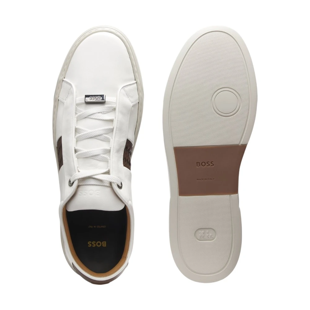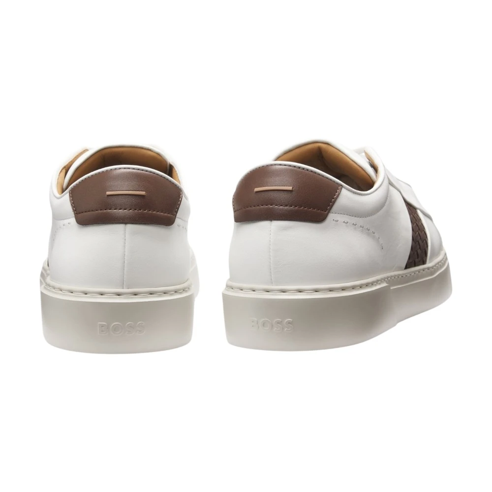 Мужские кеды Boss Gary Trainers в белом цвете с коричневыми вставками — это элегантное сочетание классики и современного дизайна. Модель выполнена из натуральной кожи, которая отличается мягкостью, прочностью и премиальным внешним видом. Светлая база придает обуви свежесть и универсальность, а контрастные коричневые элементы и плетёная вставка добавляют выразительности и подчеркивают внимание к деталям.