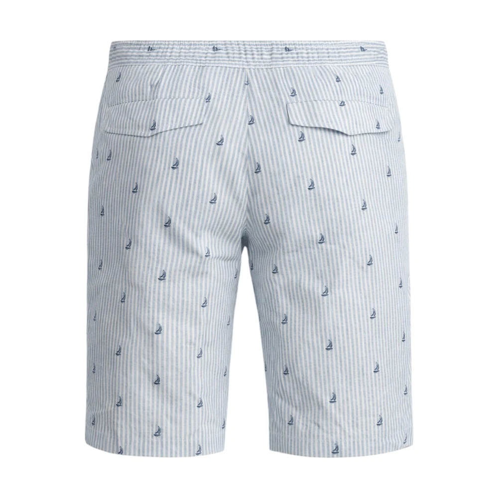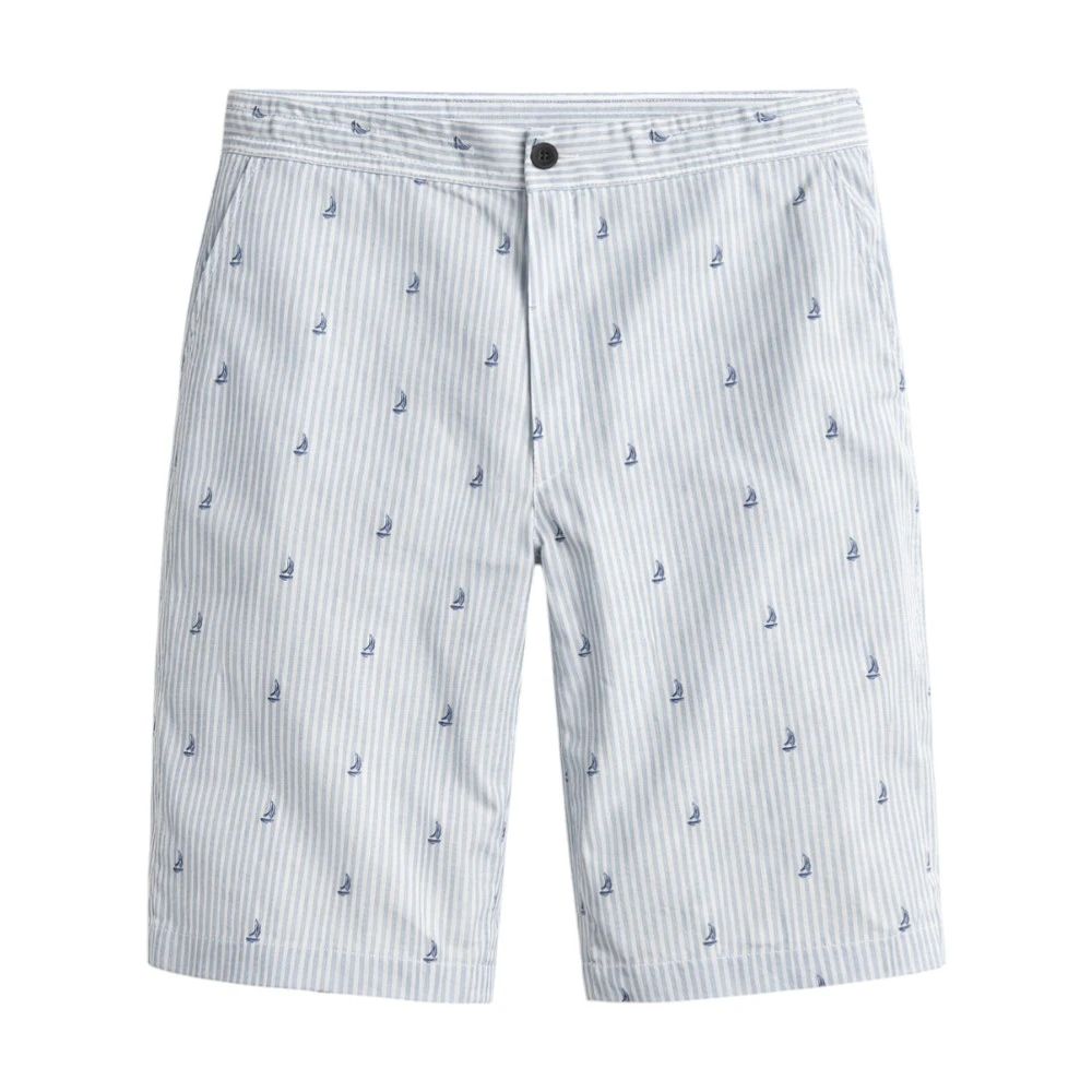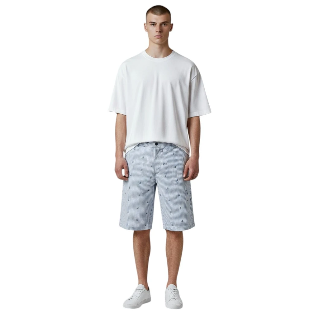 Дизайн шорт вдохновлён морской тематикой: вертикальная полоска и деликатный принт с миниатюрными парусниками создают ощущение свежести и лёгкости, ассоциируясь с отдыхом у воды и свободой движения. Такой рисунок придаёт изделию индивидуальность, оставаясь при этом сдержанным и элегантным.