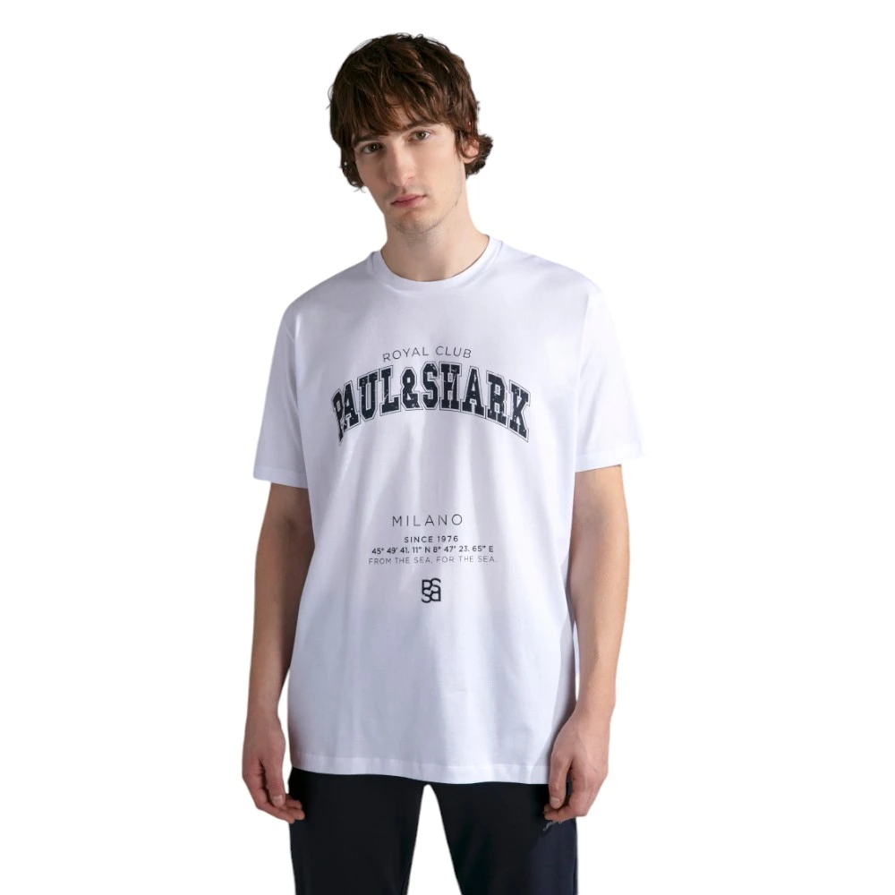 Классический крой создаёт универсальный силуэт, который легко вписывается в любой гардероб. Особое внимание привлекает графичный принт на груди с фирменной символикой Paul & Shark, выполненный в стиле морских клубов и вдохновлённый историей бренда. Декоративные элементы и надписи подчёркивают премиальный характер модели, добавляя образу индивидуальности.
