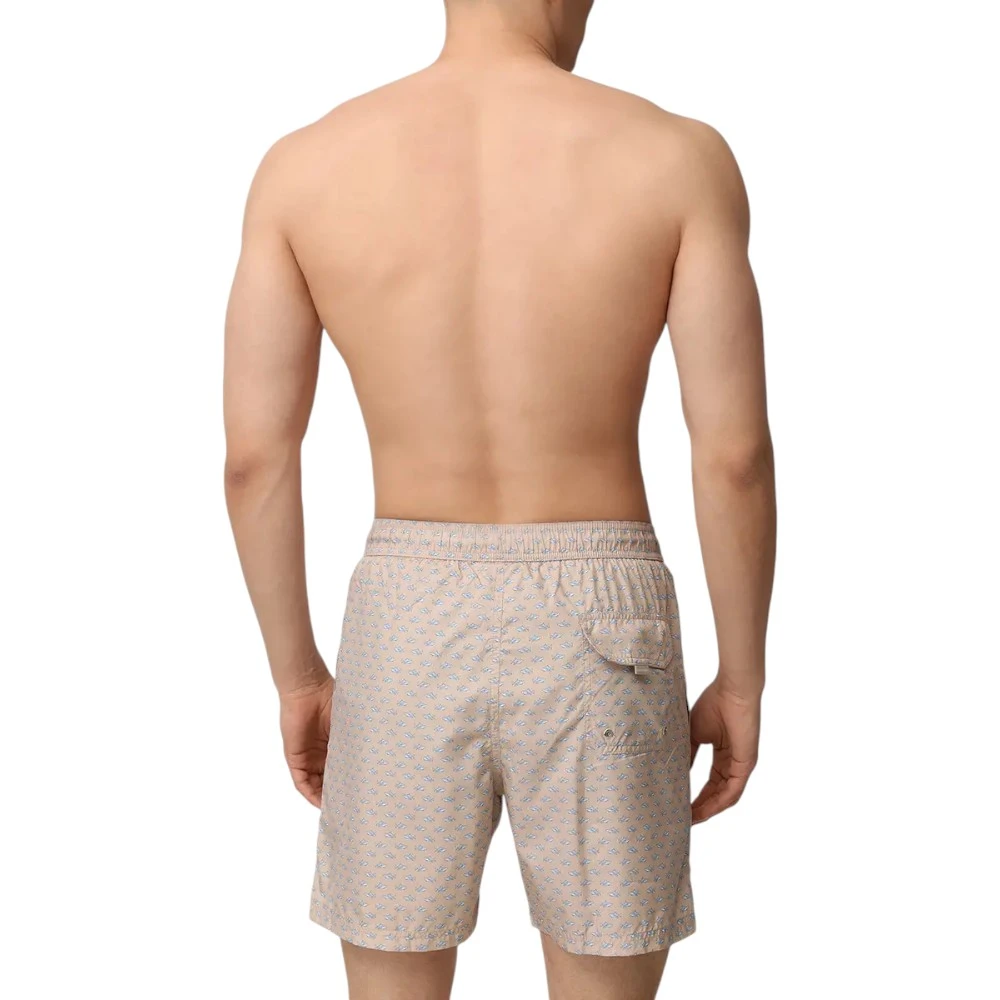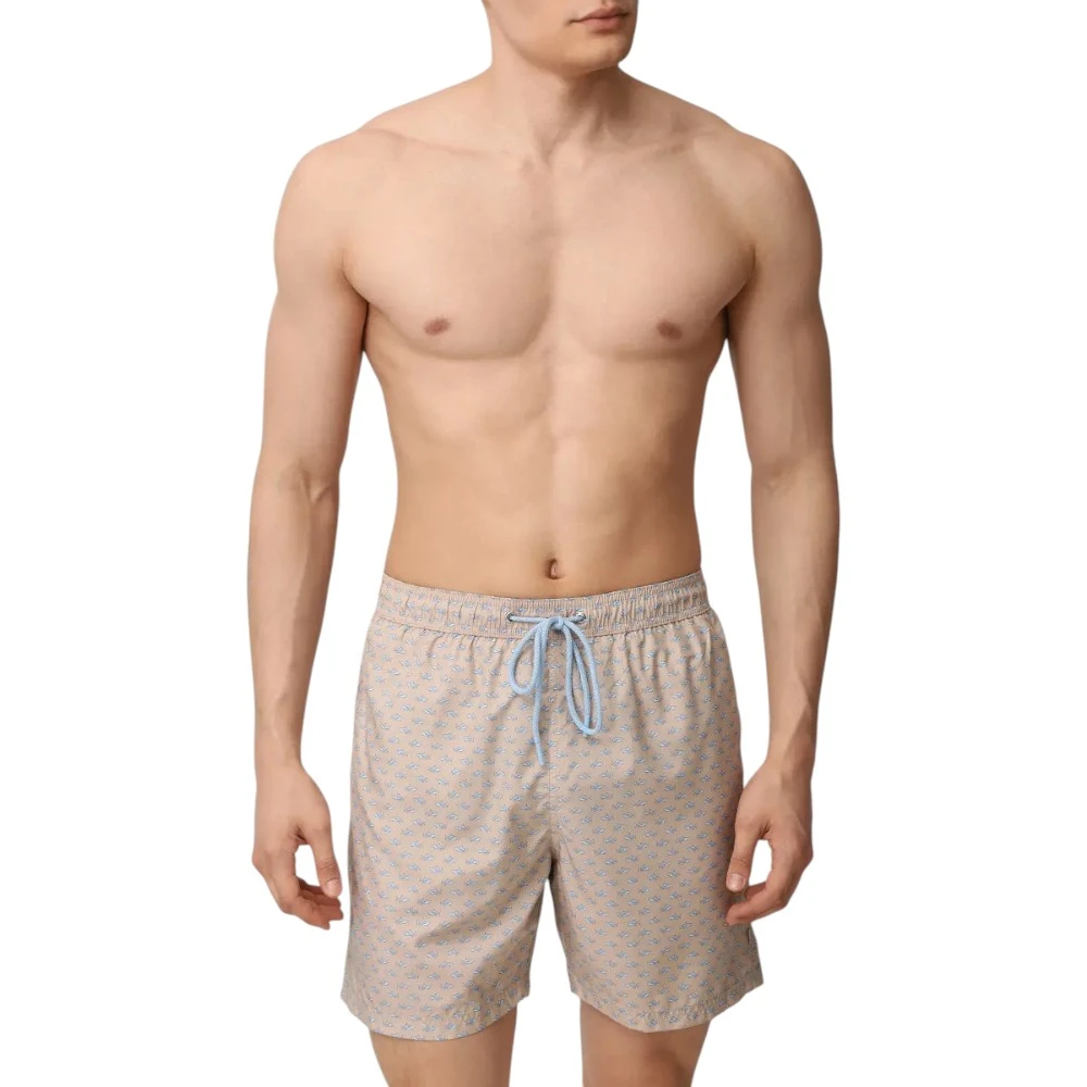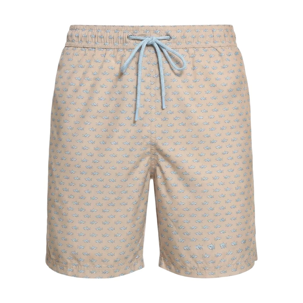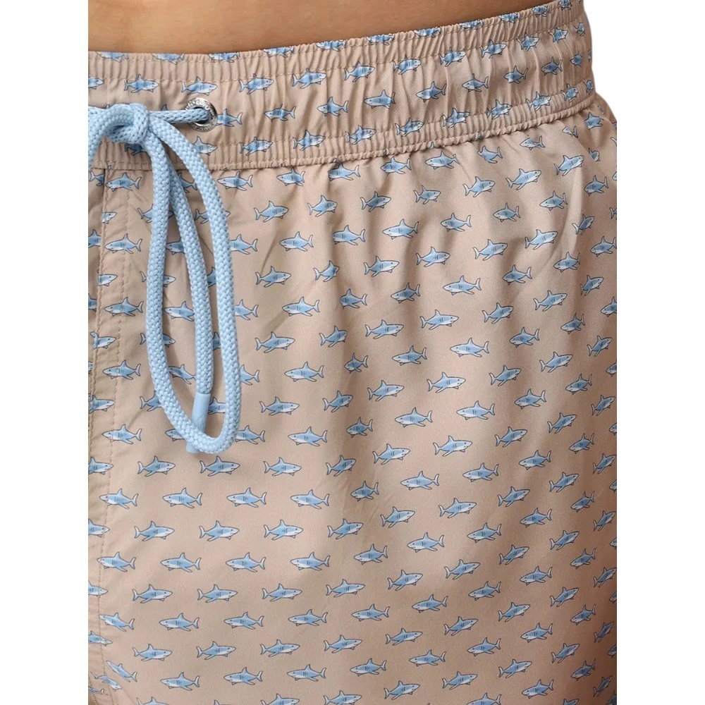 Дизайн дополнен узнаваемым принтом с миниатюрными акулами — символом Paul & Shark, который подчёркивает морскую тематику и придаёт модели динамичный характер. Светлый бежевый оттенок делает образ более мягким и универсальным, идеально подходящим для отдыха у моря, бассейна или прогулок в жаркую погоду.