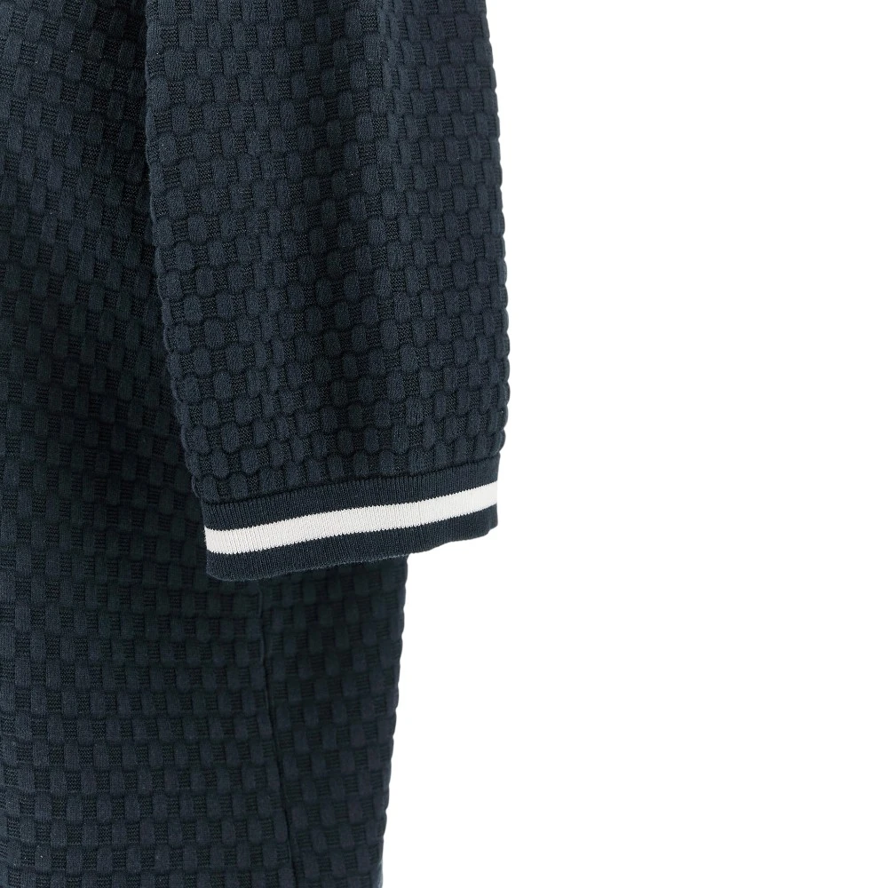 Особенность изделия — оригинальная фактурная вязка, создающая объёмный геометрический рисунок. Такой дизайн придаёт поло глубину и визуальную динамику, сохраняя при этом сдержанный и элегантный характер. Ткань лёгкая и комфортная, хорошо держит форму и не перегружает образ.