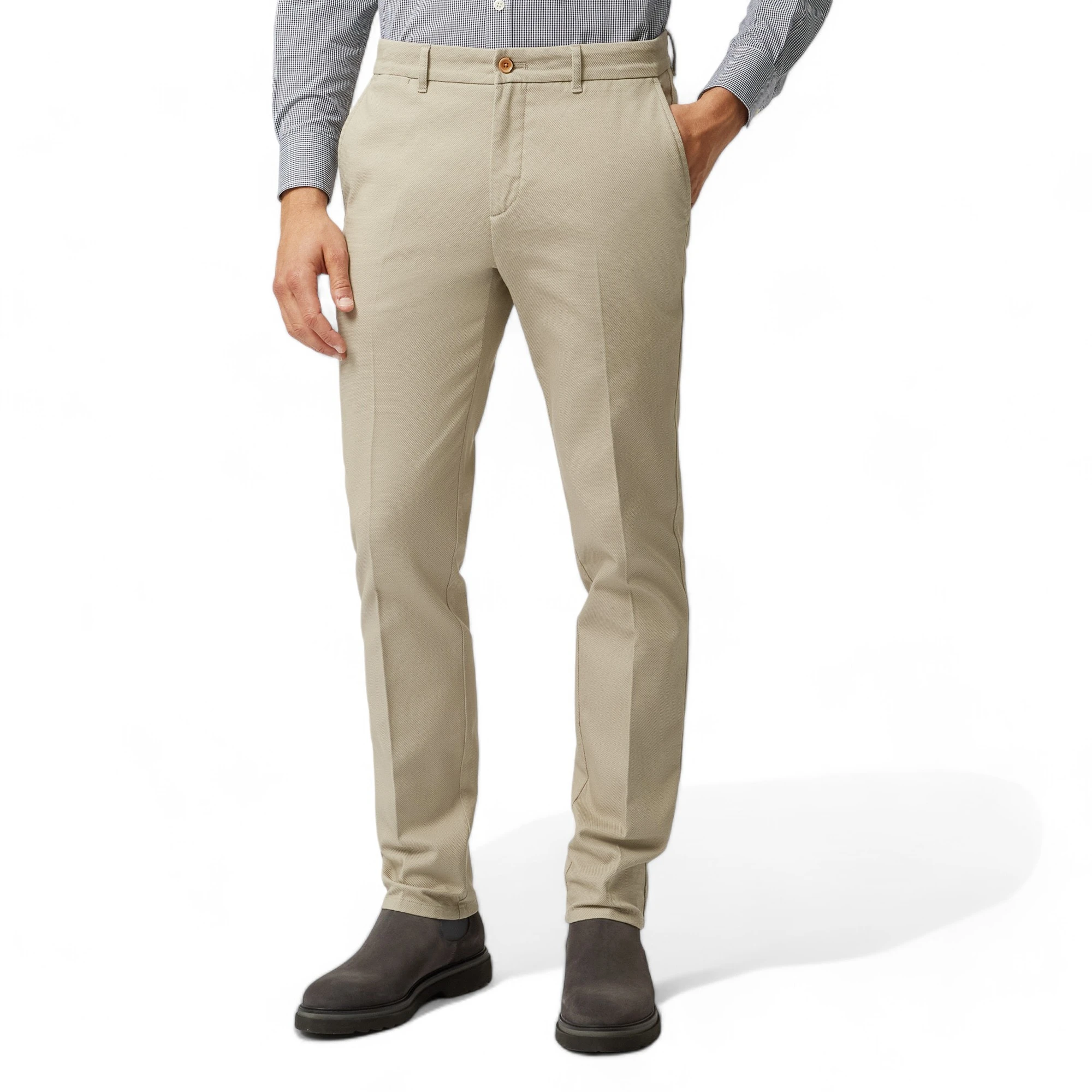 Модель отличается современным зауженным силуэтом, который подчеркивает фигуру и при этом сохраняет комфорт в движении. Четкие линии кроя и аккуратная посадка делают образ более собранным и элегантным. Продуманные детали, включая удобные карманы и качественную фурнитуру, обеспечивают практичность и долговечность в носке.