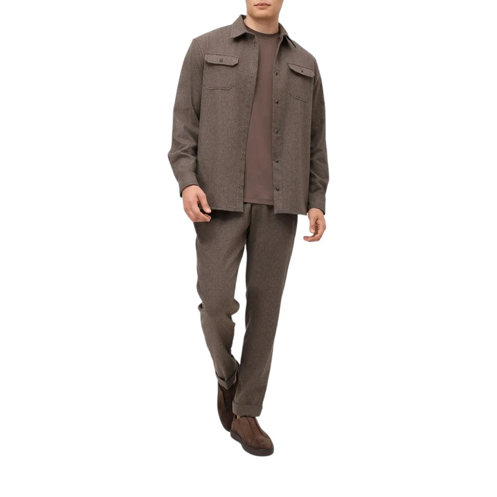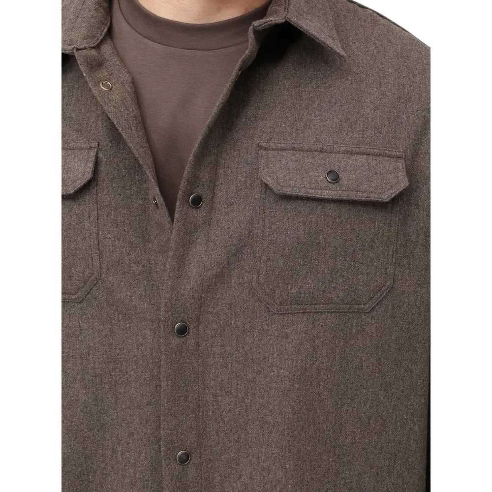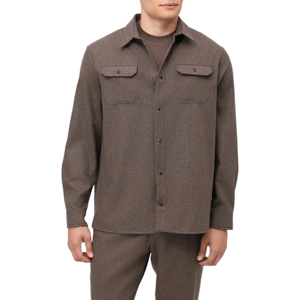 Глубокий коричневый оттенок подчёркивает благородный характер модели и делает её универсальным элементом мужского гардероба, легко сочетающимся с трикотажем, футболками, водолазками и брюками в различных стилях. Дизайн дополнен накладными нагрудными карманами с клапанами и лаконичной застёжкой на кнопках, что придаёт изделию современный акцент без потери элегантности.