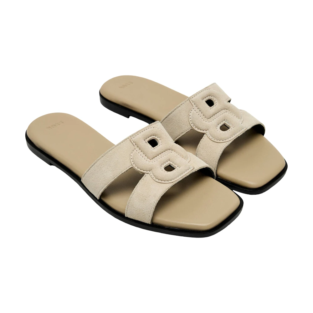 Фирменный элемент в виде буквы B встроен в верхнюю часть и выступает единственным акцентом, поддерживая узнаваемый стиль бренда. Бежевый оттенок легко сочетается с нейтральной палитрой и летними тканями, позволяя комбинировать модель с платьями, шортами, денимом и лёгкими костюмами.