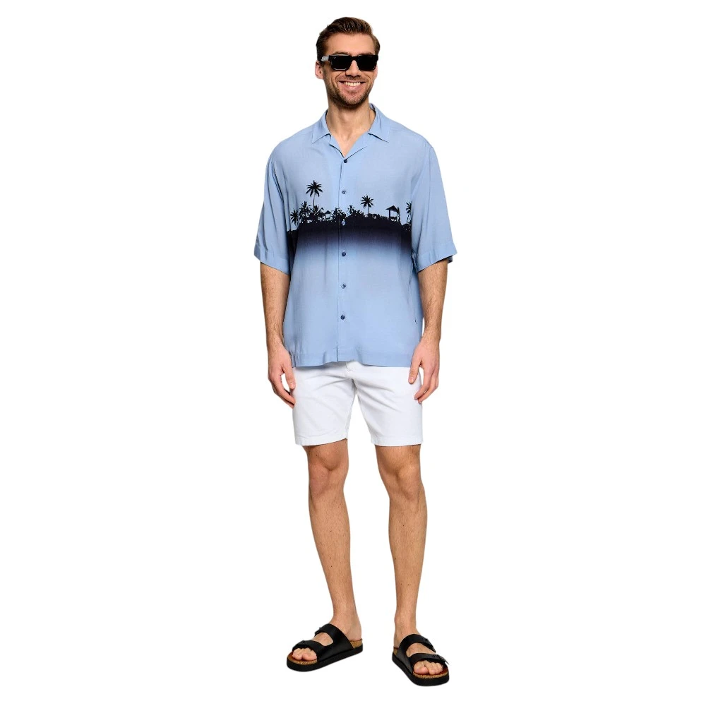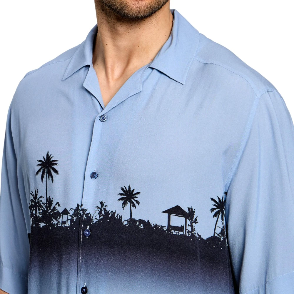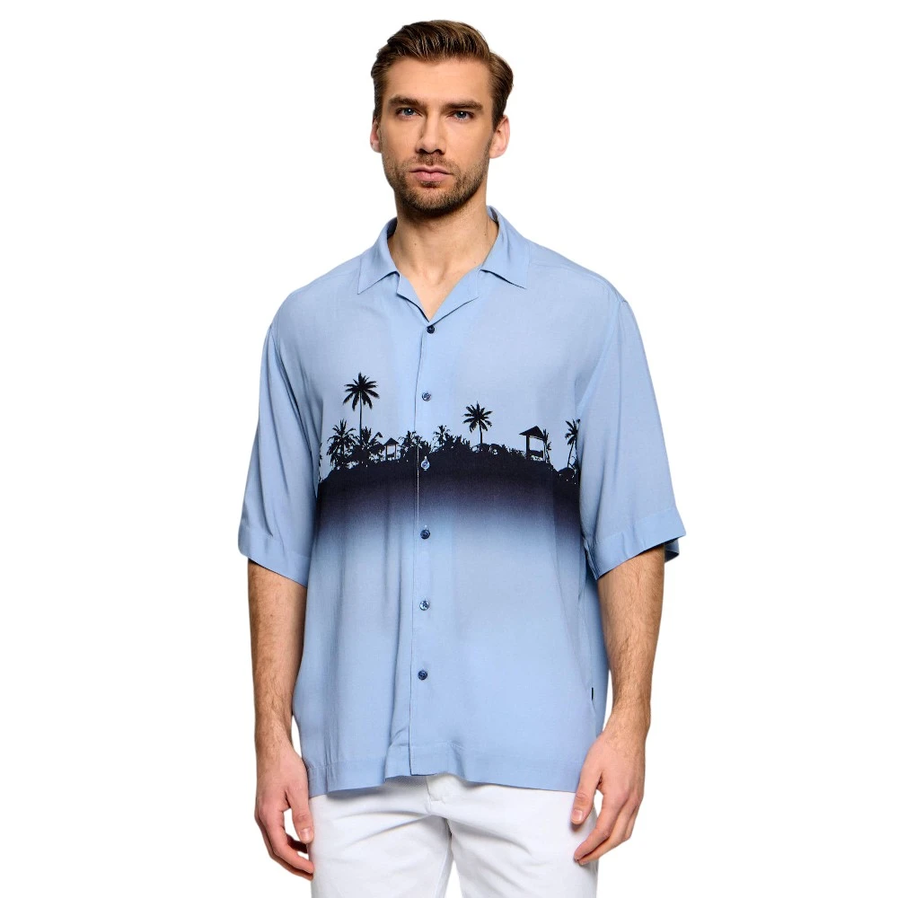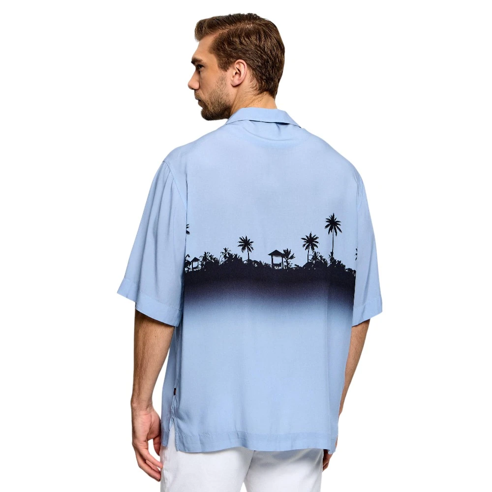 Голубой оттенок добавляет образу свежесть и лёгкость. Он легко сочетается с джинсами, брюками или шортами, позволяя создавать разнообразные образы — от расслабленных до более аккуратных. Рубашка отлично подойдёт для прогулок, встреч и отдыха, дополняя гардероб современного мужчины.