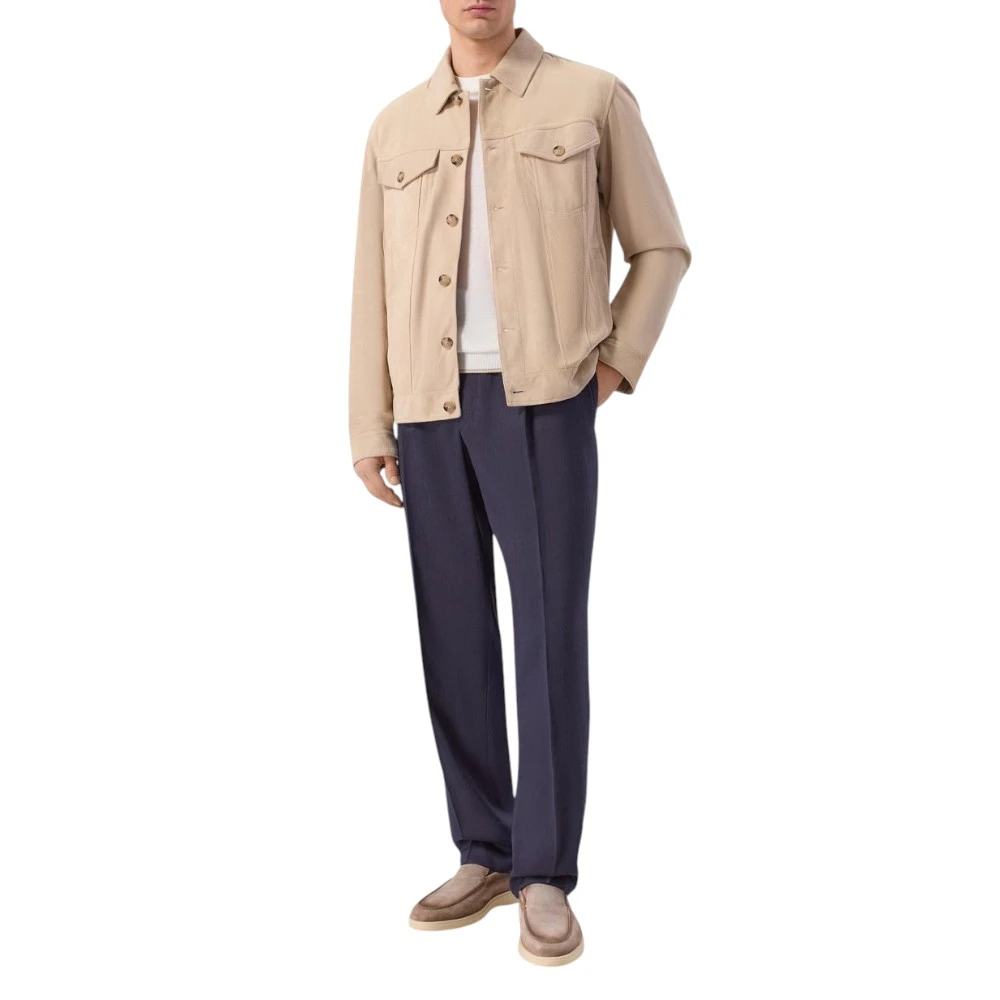 Состав ткани — 52% лён, 33% шерсть и 15% мохер — обеспечивает уникальное сочетание лёгкости, прочности и благородного внешнего вида. Лён отвечает за воздухопроницаемость и комфорт в тёплую погоду, шерсть помогает сохранять форму и аккуратный силуэт, а мохер придаёт ткани мягкость и лёгкий изысканный блеск. Такой материал выглядит дорого и остаётся комфортным даже при длительной носке.