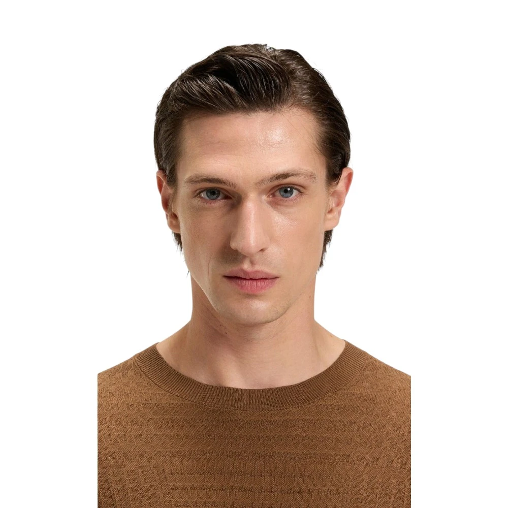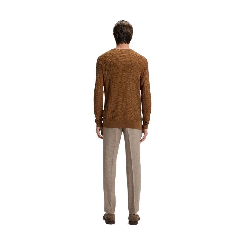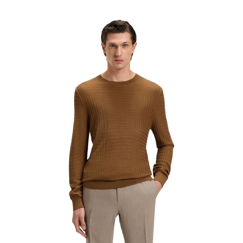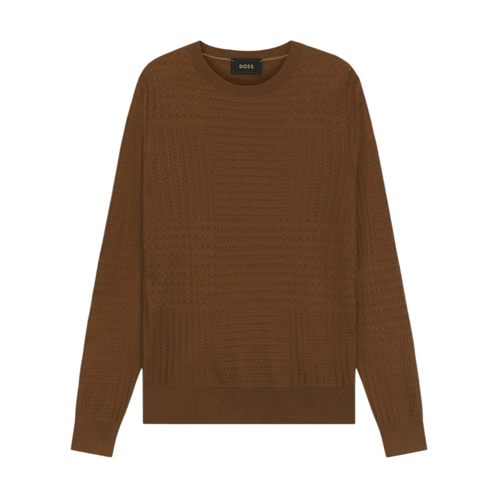 Фактурная вязка с геометрическим узором делает модель более выразительной и визуально глубокой. Коричневый оттенок выглядит тепло, дорого и универсально, позволяя легко сочетать свитер с классическими брюками, джинсами, чиносами или светлыми костюмными моделями. Круглый вырез горловины, длинные рукава и прямой крой подчеркивают лаконичную эстетику бренда BOSS и обеспечивают удобную посадку.