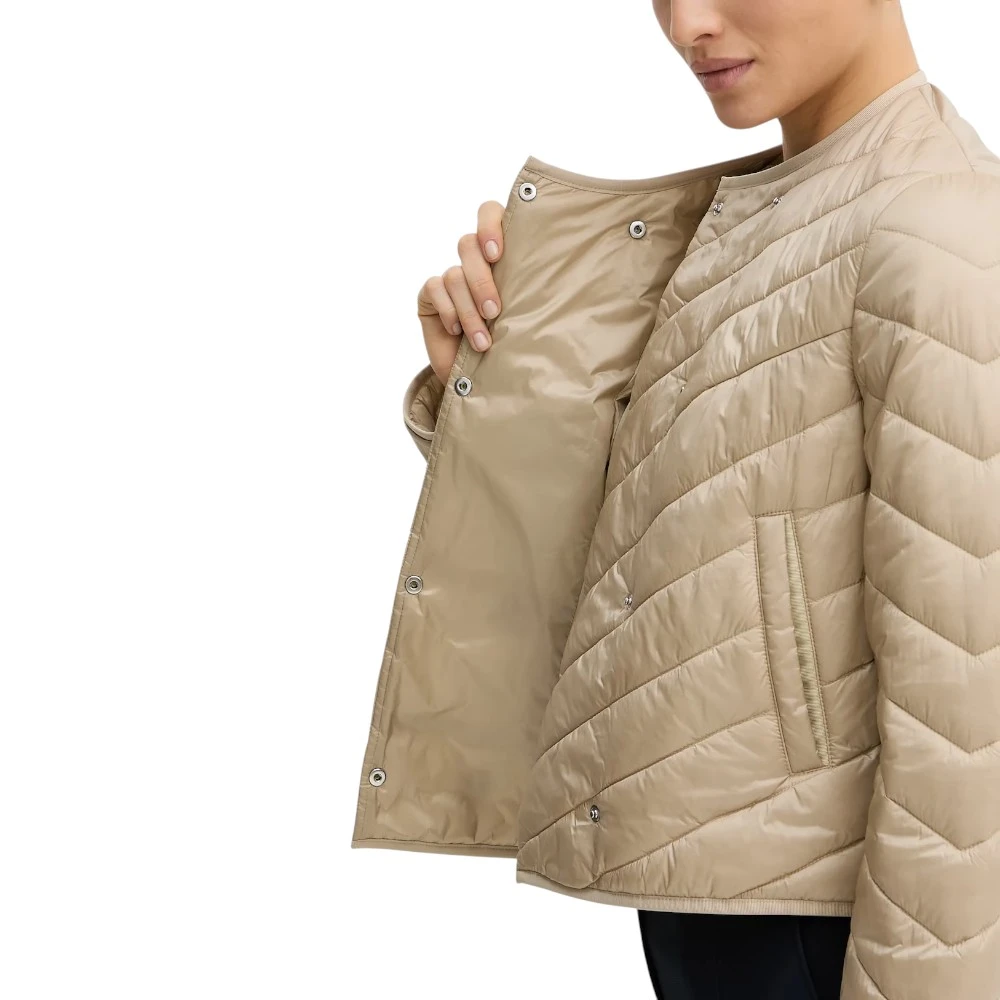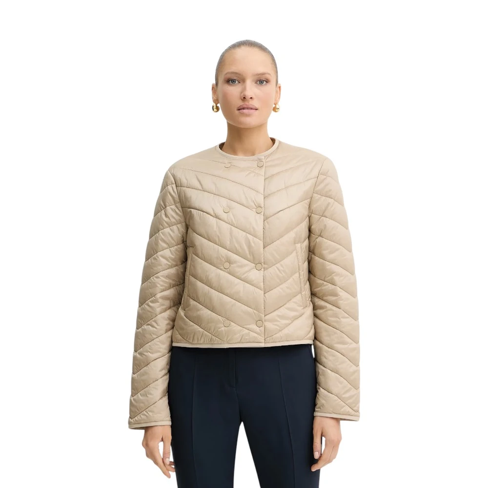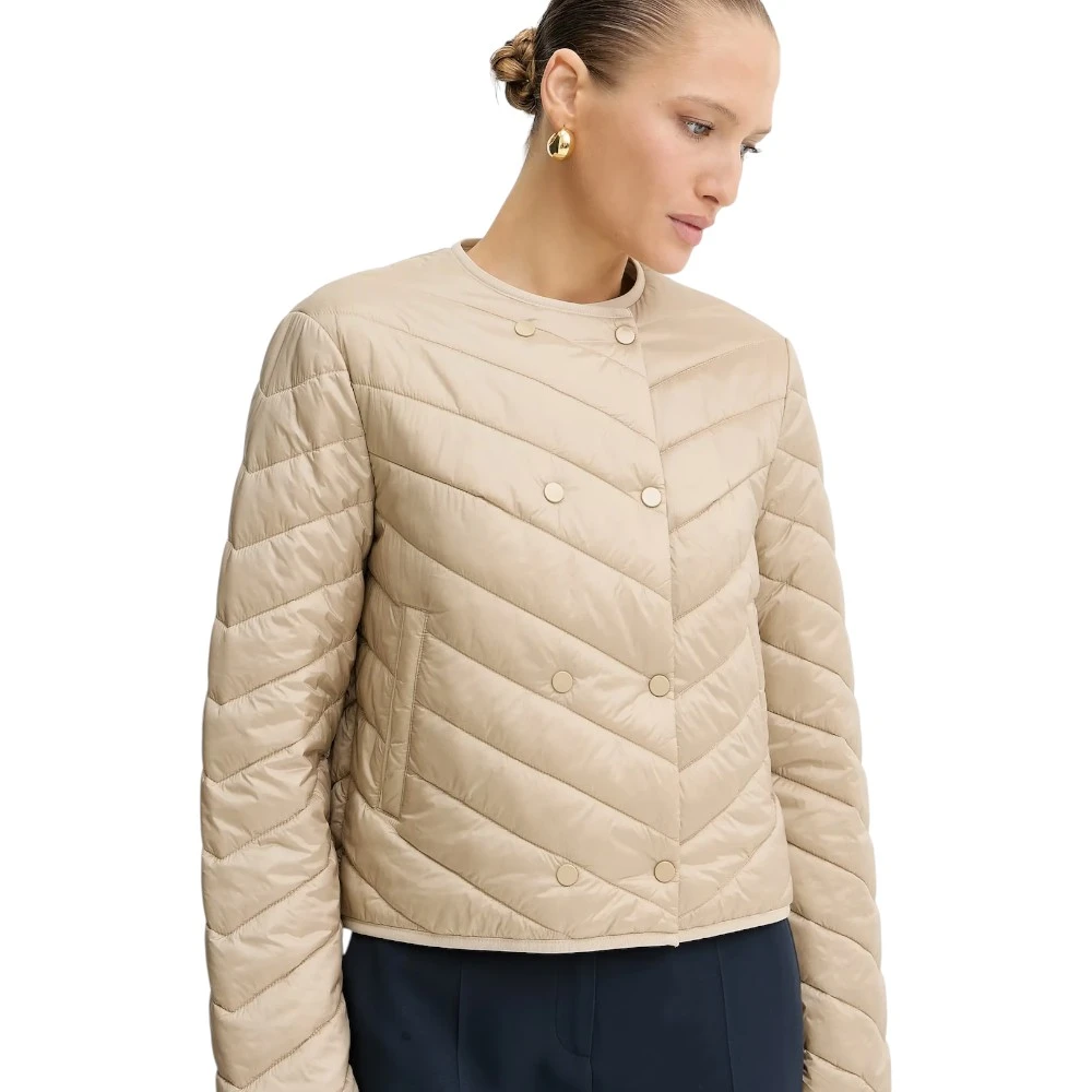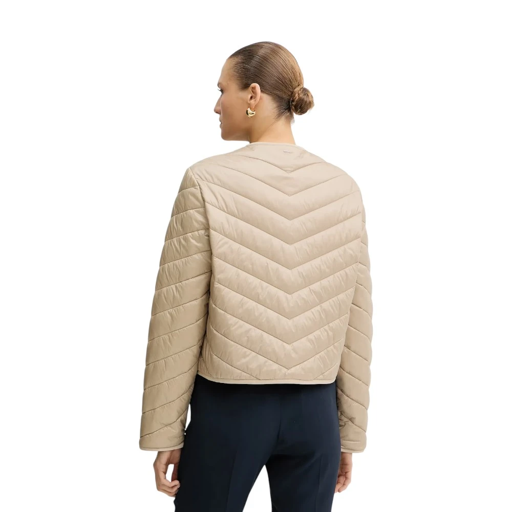 Куртка Boss Pranella имеет круглый вырез без воротника, благодаря чему выглядит минималистично и утончённо. Застёжка на кнопках удобна в использовании, а боковые прорезные карманы добавляют функциональности. Диагональная стёжка визуально вытягивает силуэт и делает образ более динамичным. Универсальный бежевый оттенок легко комбинируется с базовыми и яркими цветами гардероба.