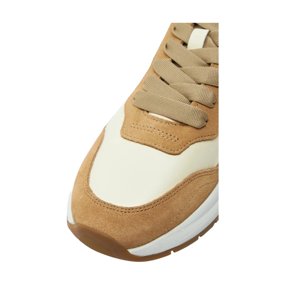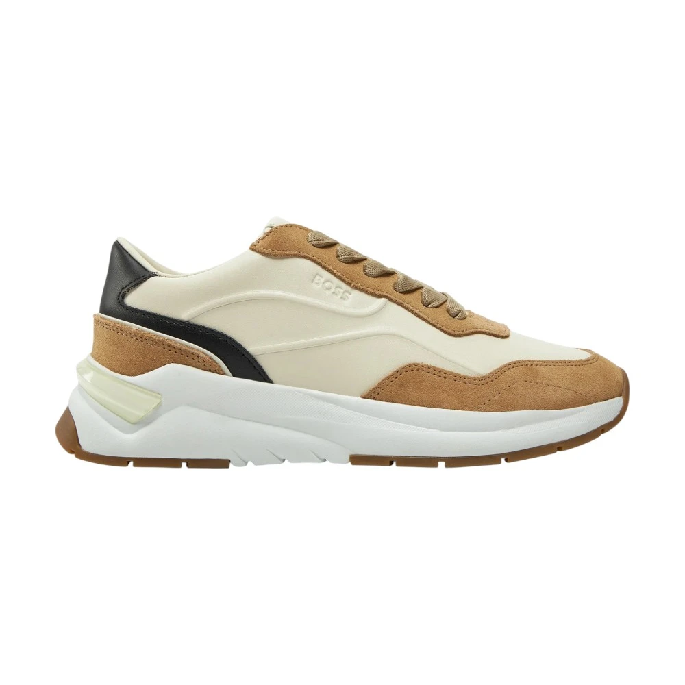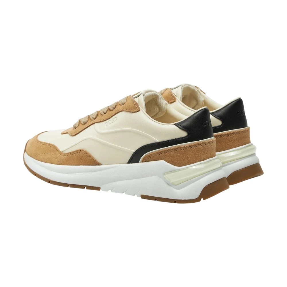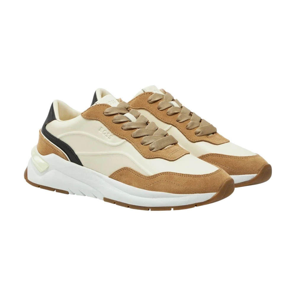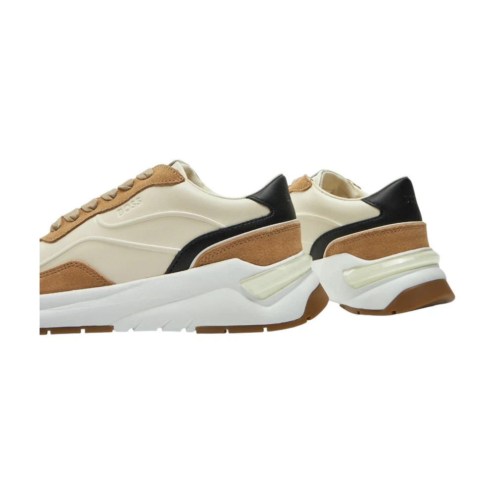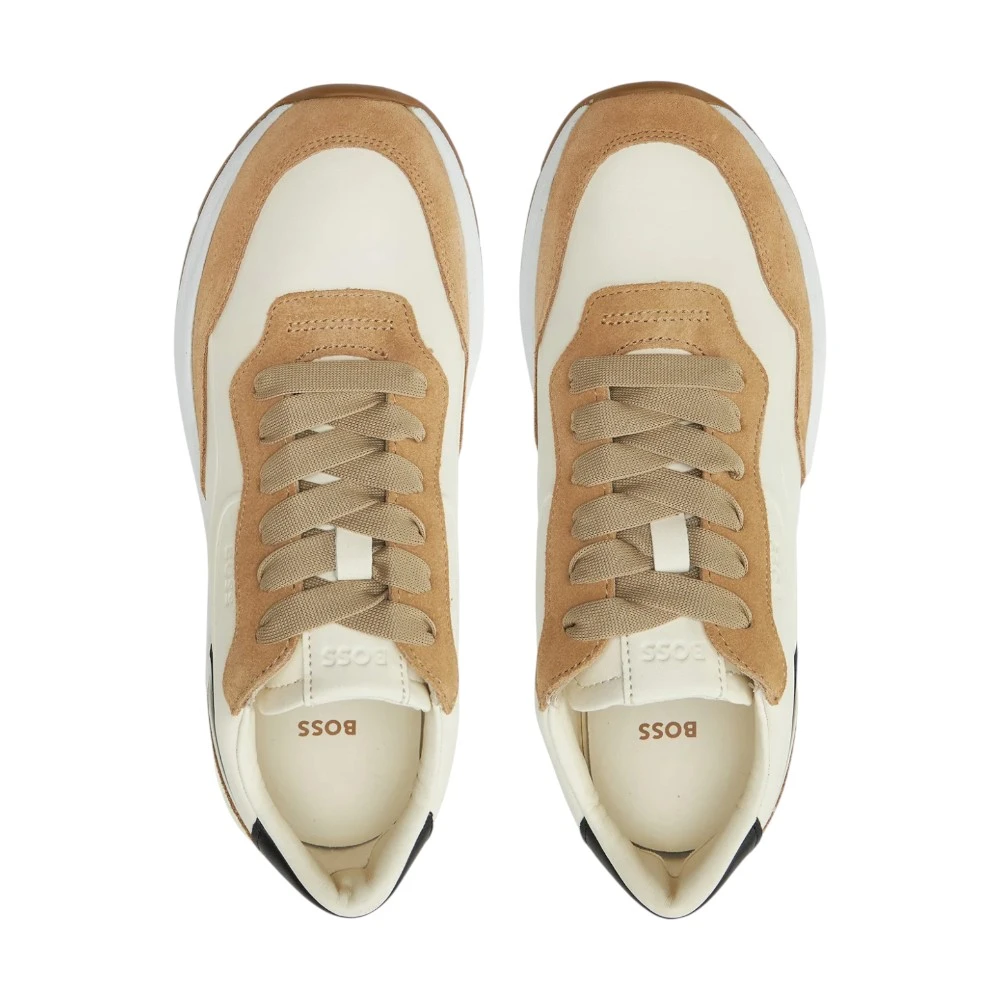 BOSS Womenswear’dan zamonaviy logotipli krossovkalar. Ushbu sport uslubidagi juftlik yumshoq zamshni ham o‘z ichiga olgan bir nechta turdagi matolardan tayyorlangan.