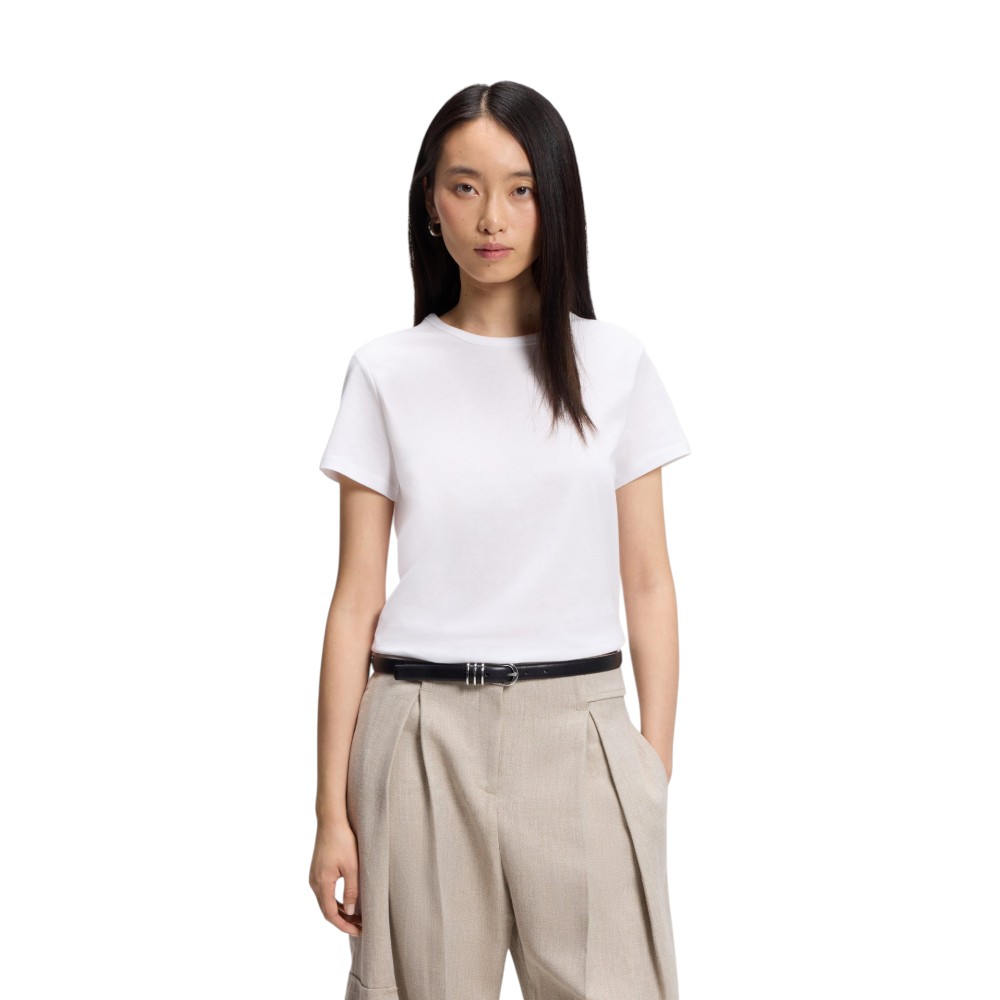 Ayollar uchun Boss Eventsa oq futbolkasi — bu ixcham nafislik va zamonaviy minimalizm timsolidir. Model 100% tabiiy paxtadan tayyorlangan bo‘lib, kun davomida yumshoqlik, qulaylik va yaxshi havo o‘tkazuvchanlikni ta’minlaydi. Mato tanaga yoqimli tegadi, shaklini yaxshi saqlaydi va ko‘p marotaba yuvilgandan keyin ham o‘z ko‘rinishini yo‘qotmaydi.
