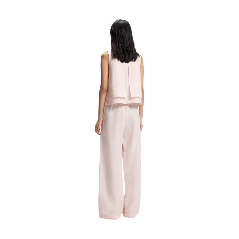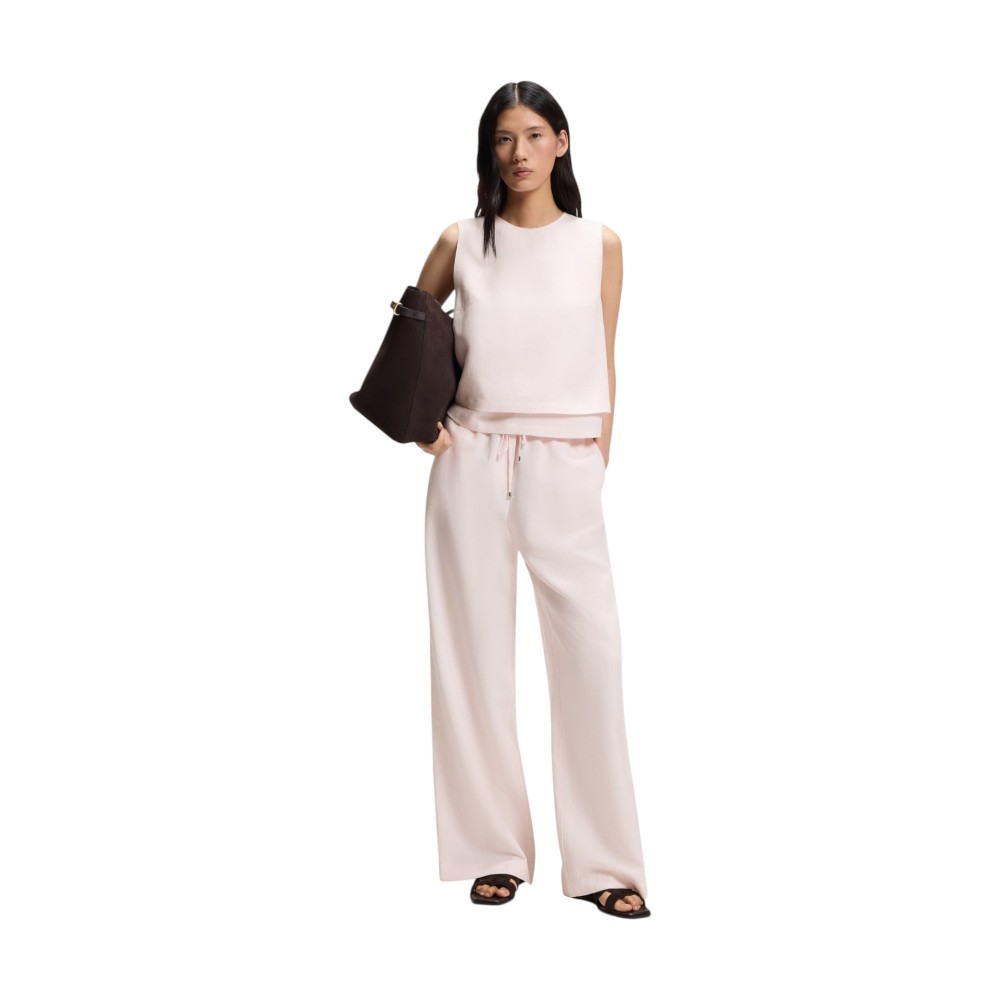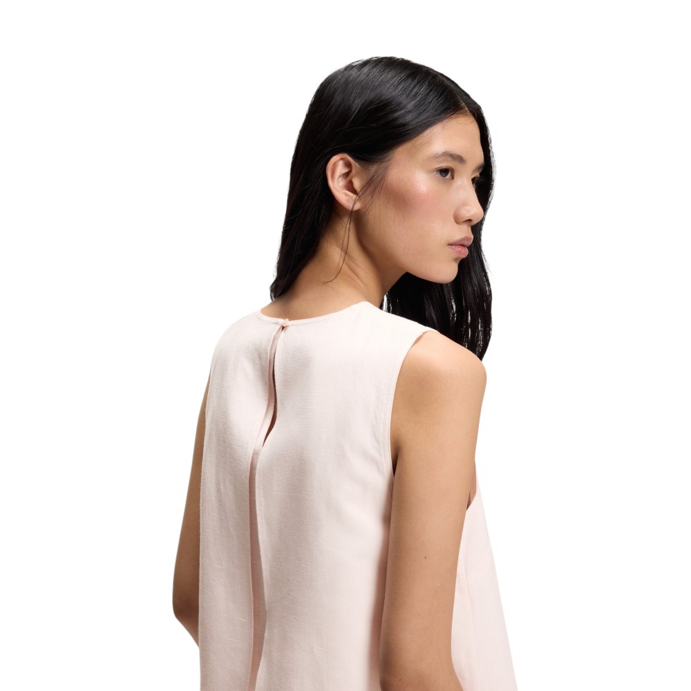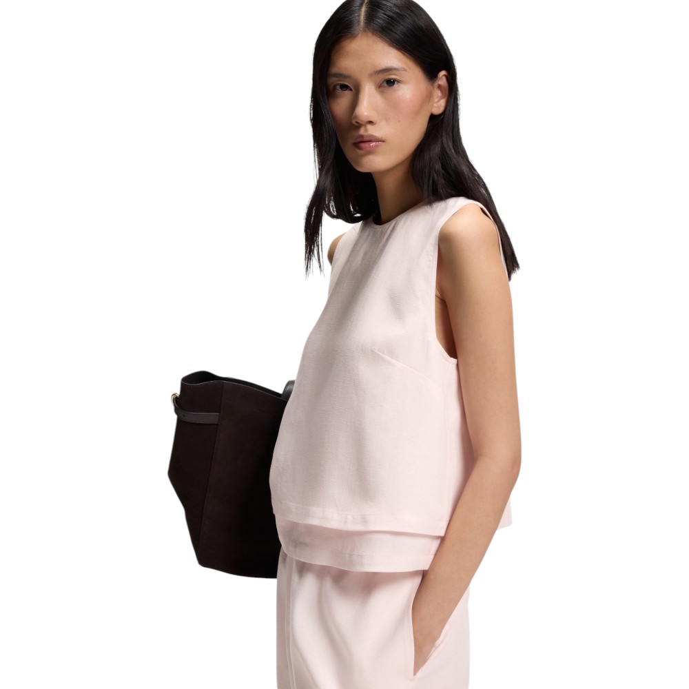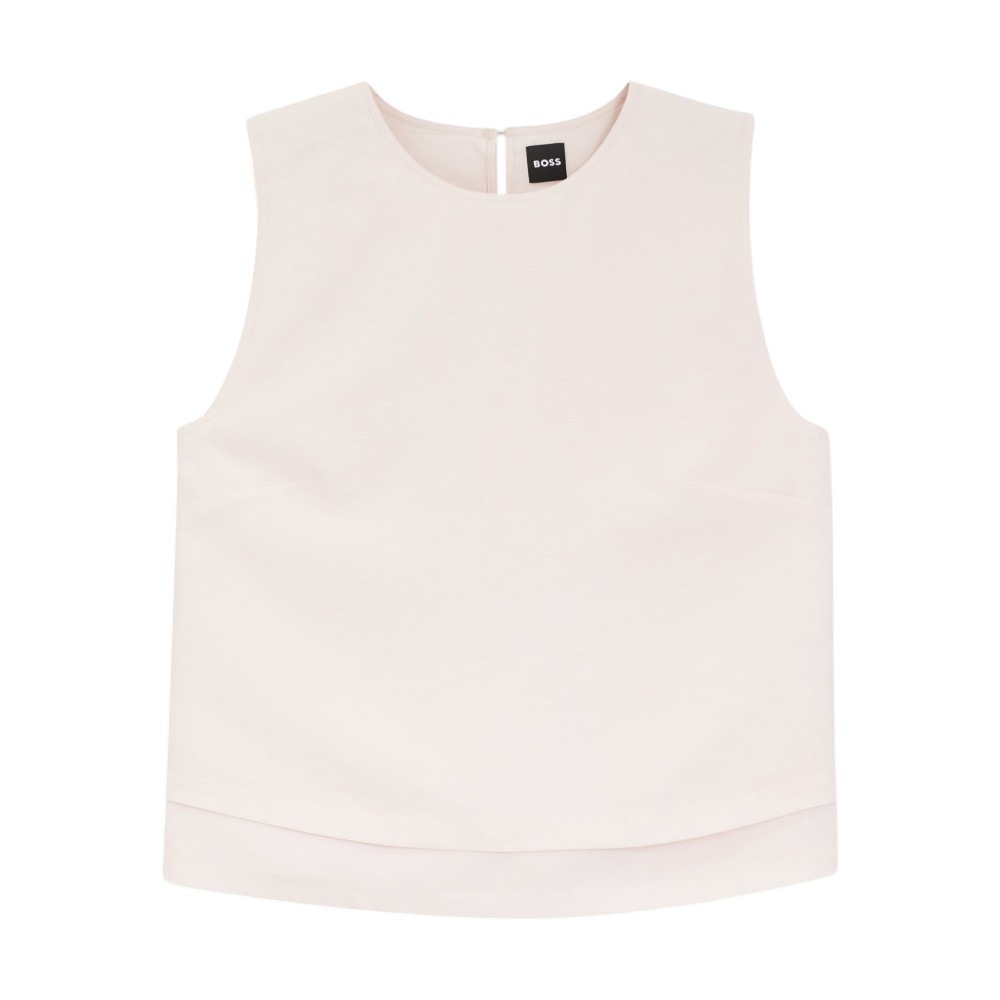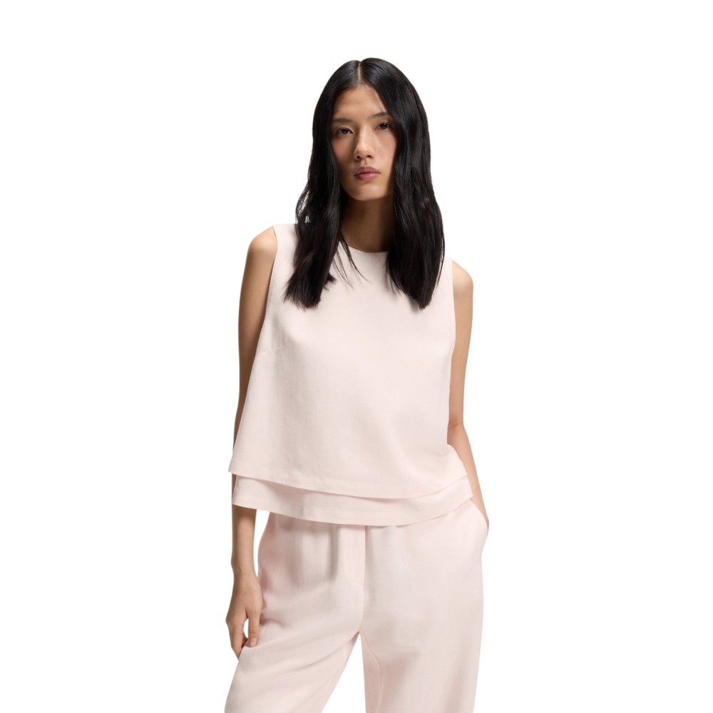 Ayollar uchun Boss Bliny och pushti rangdagi top yengillik va nafislikni birlashtiradi. Pastel tus obrazga noziklik bag‘ishlaydi va klassik shimlar hamda kundalik denim yoki zig‘ir matoli kiyimlar bilan uyg‘unlashadi. Yengsiz minimalistik fason modelni issiq mavsum uchun qulay va universal qiladi.