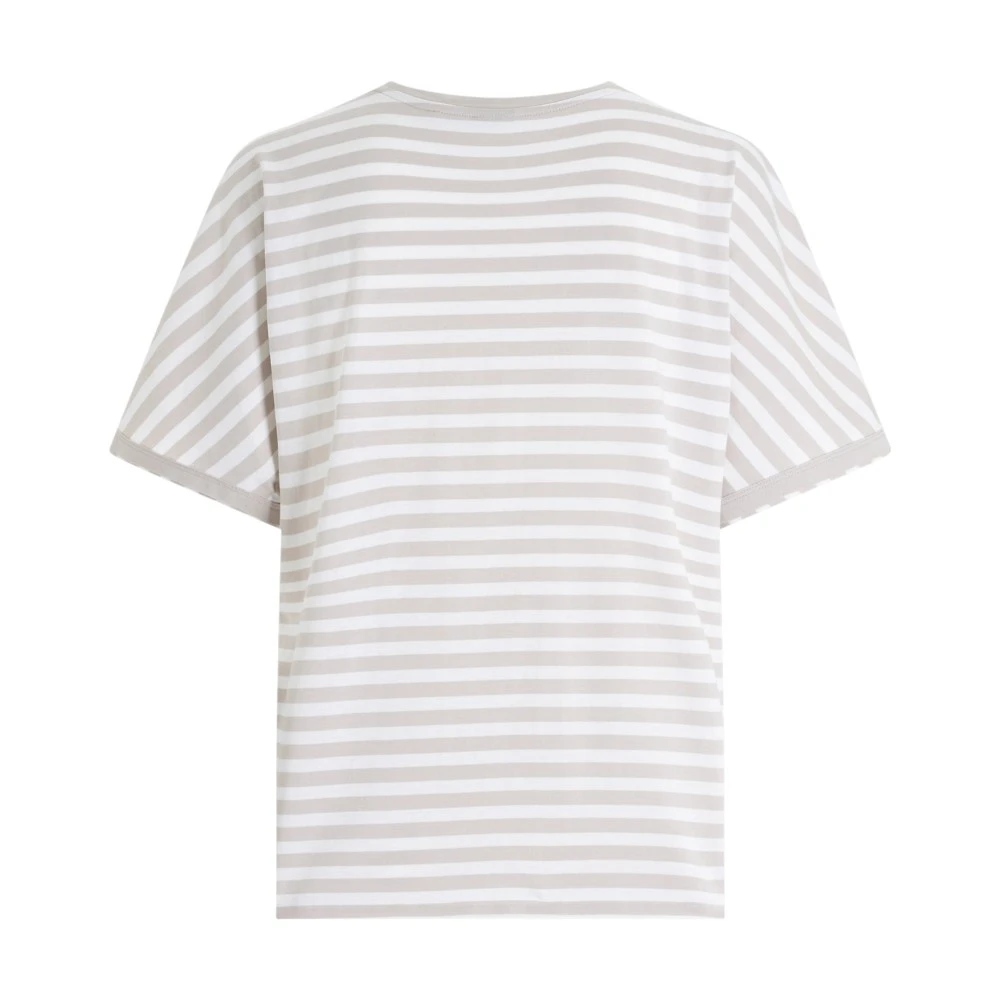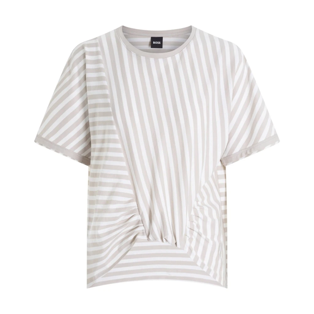 Женская футболка Boss Ediaga — универсальная модель на каждый день с фирменной сдержанностью BOSS и аккуратным дизайнерским акцентом. Белая основа дополнена пастельной полоской в светло-коричневом (бежевом) оттенке: такая гамма выглядит мягко, нейтрально и легко сочетается с любыми базовыми цветами гардероба. Особенность модели — выразительная драпировка спереди и комбинированное направление полос, благодаря чему футболка смотрится интереснее обычной классики, оставаясь лаконичной.