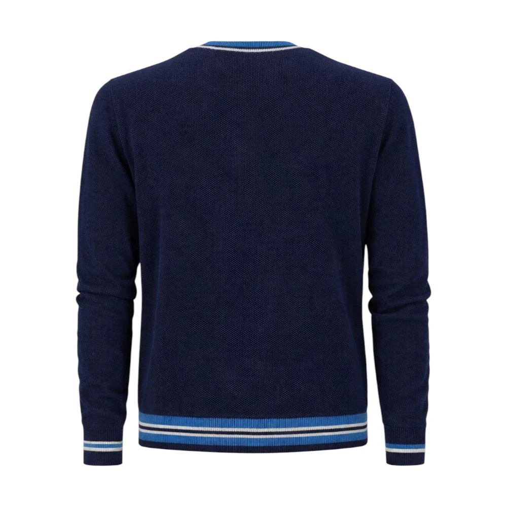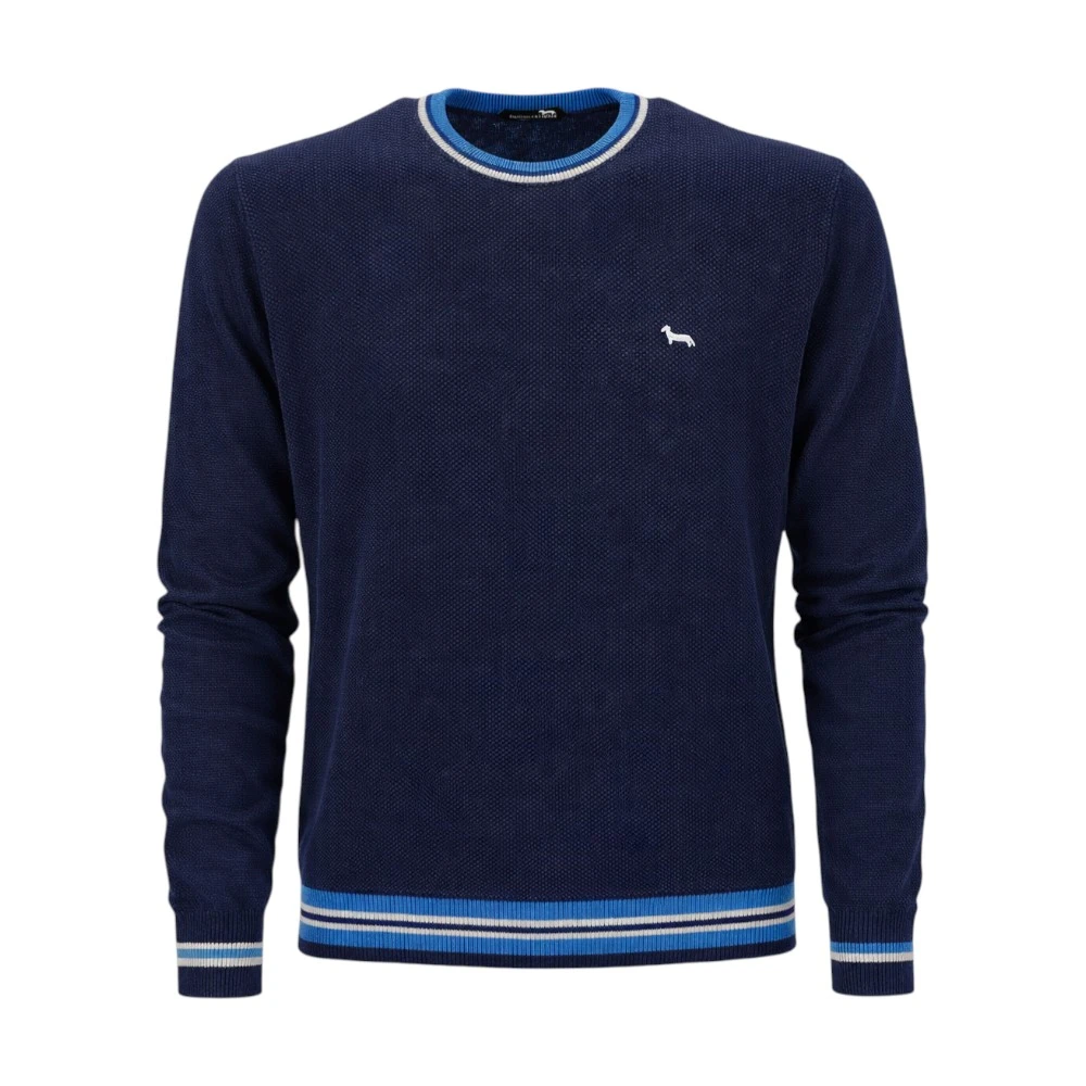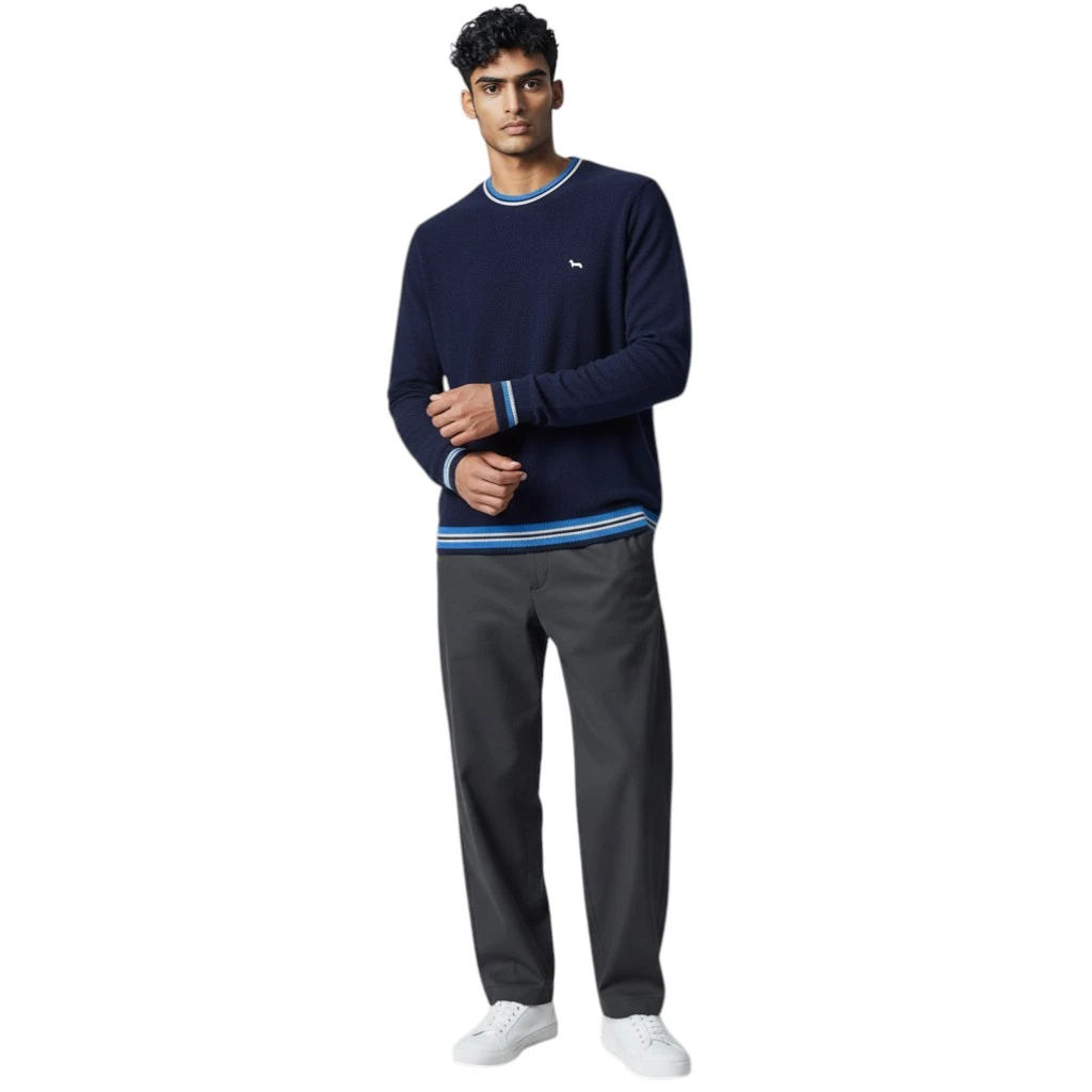 Модель отличается аккуратным круглым воротом и выразительной фактурной вязкой, которая придает изделию глубину и современный внешний вид. Контрастные полосы на манжетах и по нижнему краю создают стильный акцент и делают дизайн более динамичным. Фирменный логотип Harmont & Blaine в виде таксы на груди подчеркивает принадлежность к известному итальянскому бренду.